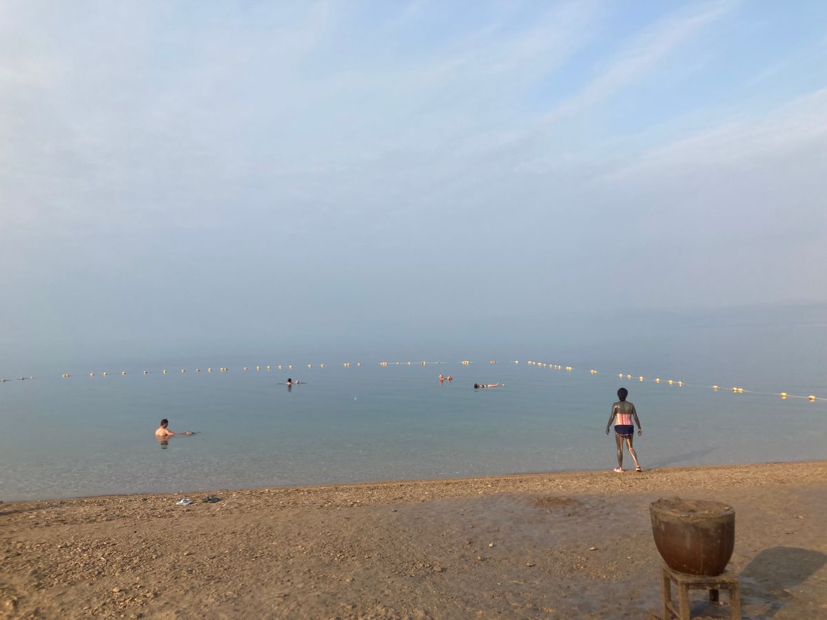 死海ビーチは早朝がおすすめです。人も少なく暑さもさほどでなく快適に泥塗りや浮遊体験が楽しめます!