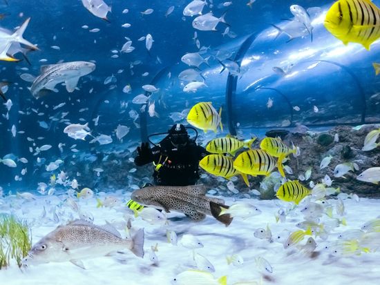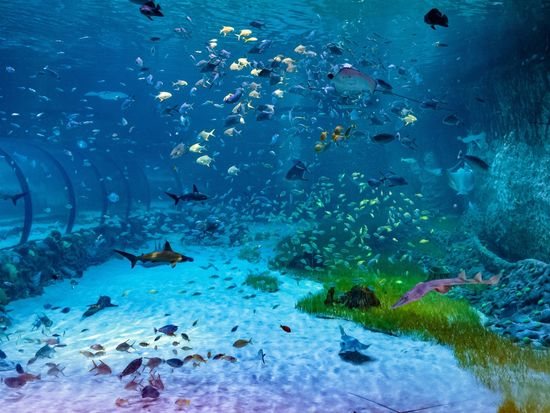 透明トンネルを通り、魚やサメが泳ぐ水中世界を360度楽しめます。