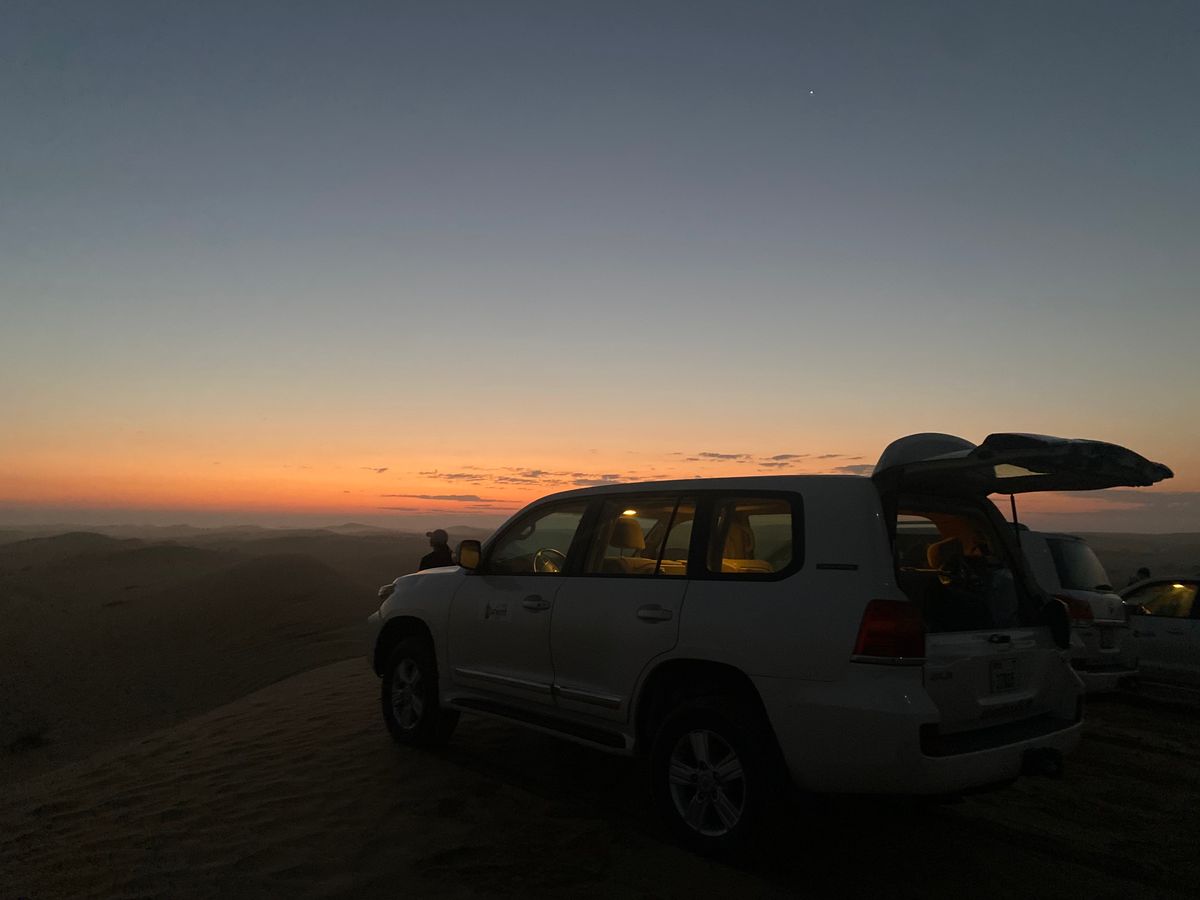 ランクルで高速に乗り砂漠に向かいました。砂漠を激走するアクティビティは、酔い止めを服用していても若干酔いましたが、とても楽しかったです。車内は大盛り上がりでした。