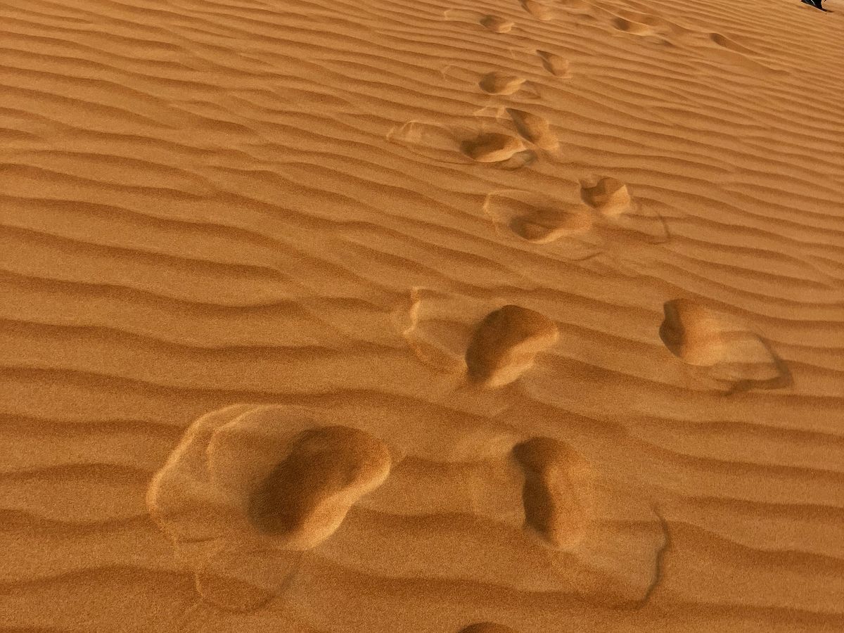 砂漠の砂はとても粒子が細かくてサラサラです。履物はスニーカーよりサンダルがいいと思います!