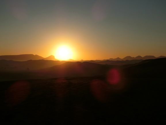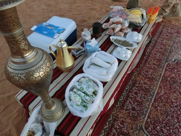 1時間前には真っ暗の中砂漠に到着。そしてそのまま暗闇の中朝食。最初の30分くらいは真っ暗で周りも見えなかったので、到着は30分前でも十分だったのではないかと思います。また朝食は日の出後でも良かったのでは。