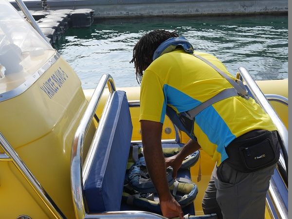 さて、ボートは新しくきれいなボートです、まずはライフジャケットを着ます。そして説明を受けて、カメラ以外の手荷物は椅子の中にしまいます