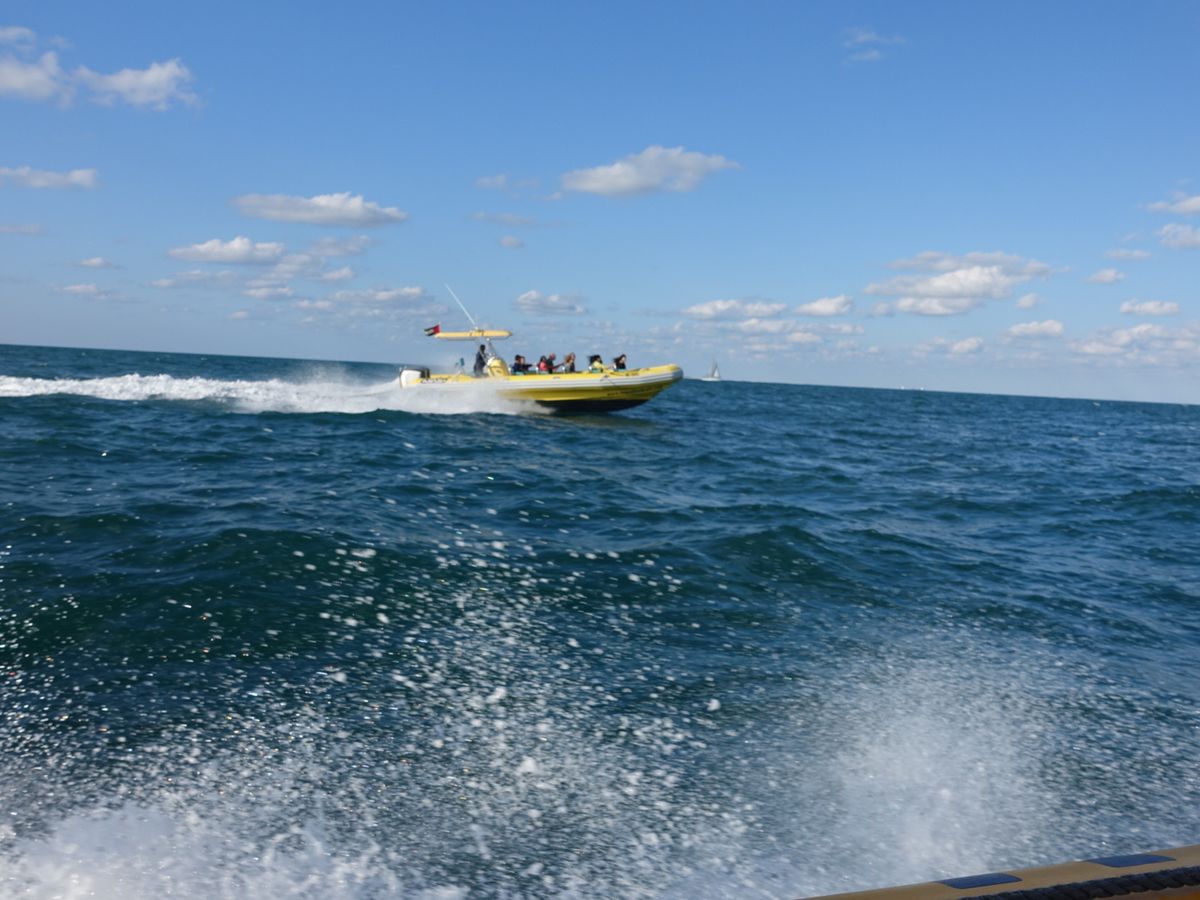 乗船すると、最初はマリーナのビル群をゆっくり、その後ぐんとスピードが上がります!私たちは先端と二番目に座ったので、波で弾むボートの衝撃がダイレクトに!水も何度が顔にかかる!!想像以上のスピードに、思わず叫んでしまうほどでした。