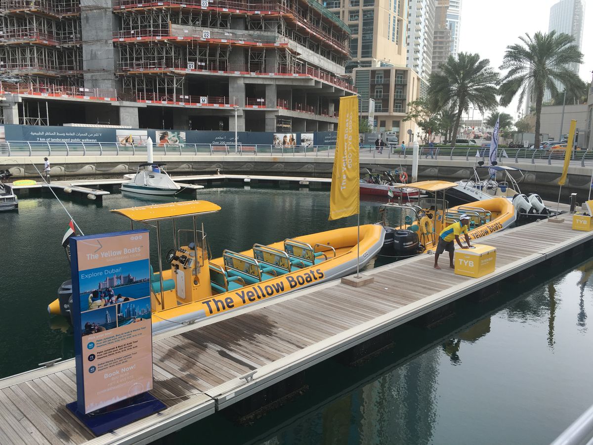 集合場所はDamac Properties駅から徒歩12分と案内にありましたが、Damac Properties駅からトラムに乗り換えて行くと駅からすぐで便利でした。湾のところにいくとイエローボートののぼりが簡単に見つけられました。