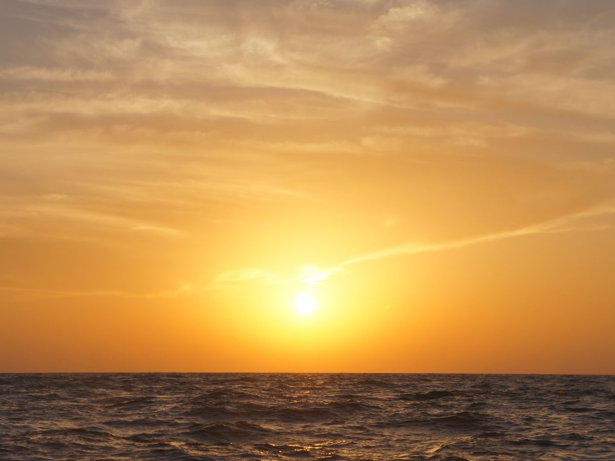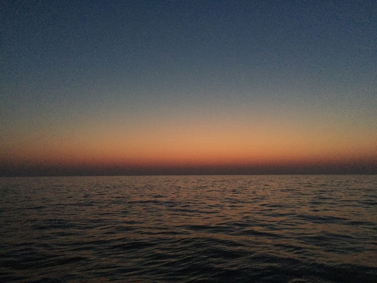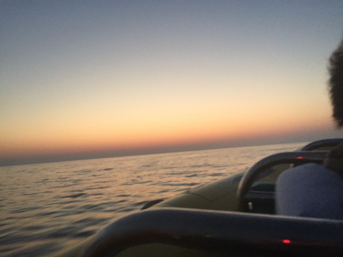 その後海にでた頃に日が落ち、急に暗くなってきました。そのとき、操舵手の人から5分ほどスピードを出して距離を走るからしっかり捕まってるようにと言われました。