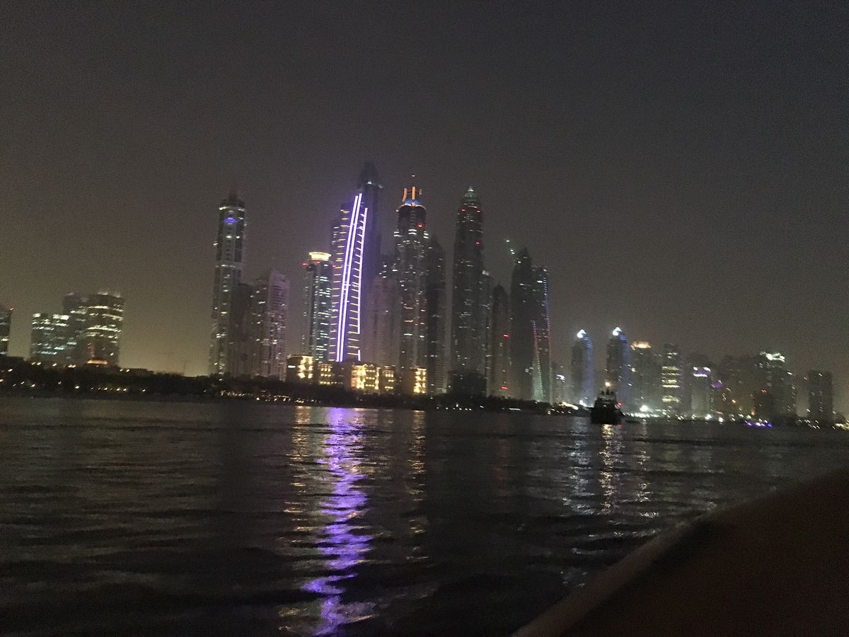 夜といっても夏のドバイで蒸し暑い中、ボートのスピードがマックスになると海風がとても気持ちよく、ビル群を眺めながらのセーリングは最高です。