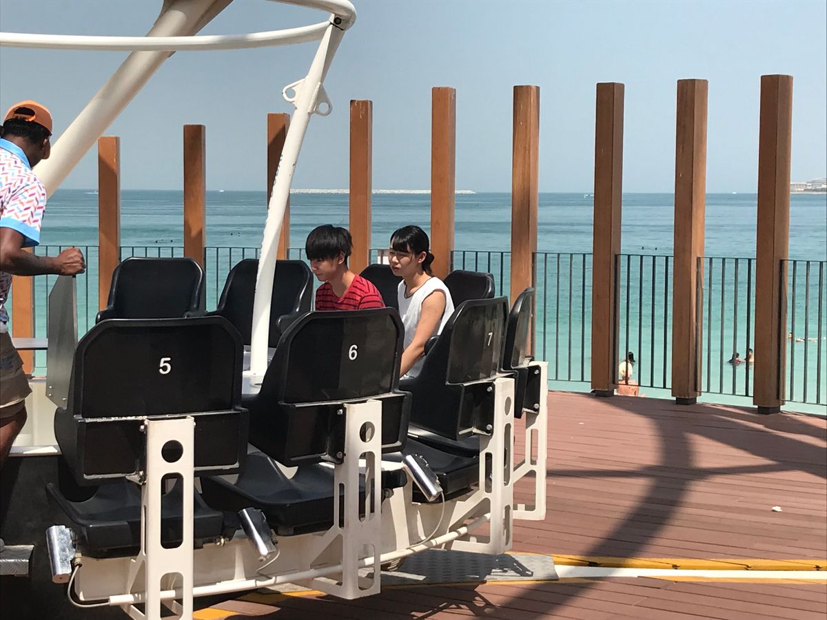 予定が変更になり日にちの変更希望をベルトラさんにしたところ、催行会社に連絡が取れるまで親切に何度も連絡くれました。その節はありがとうございました。最終的にはベルトラさんか催行会社に連絡してくれれば大丈夫とのことでしたが近くに行ったので、直接行ってみたら乗せてくれました。まあ、ガラスキだったので断らなかったのかもですが。 タクシーに乗りバウチャーにタクシーで行く場合:「The Beach, JBR」とお伝えくださいと書いてあったので、その通り伝えましたが運転手さん分からずスマホで地図を見せて行ってもらいました。 私達は行ってすぐ人数が集まったので飲み物とポップコーンを受け取って乗りましたが他の人は乗り合い人数(10人位)が集まるまでに飲み食べ終わっていました。そんなに高くないので、怖くもなくスリルもなく海辺に飽きたらちょっと乗ってみようかぐらいの感覚で乗るような乗り物でした。 景色がよかったのと、係の人が自分たちのスマホで撮ってくれたのが良かったです。 わざわざ時間を裂いて行くにはイマイチだと思いました。