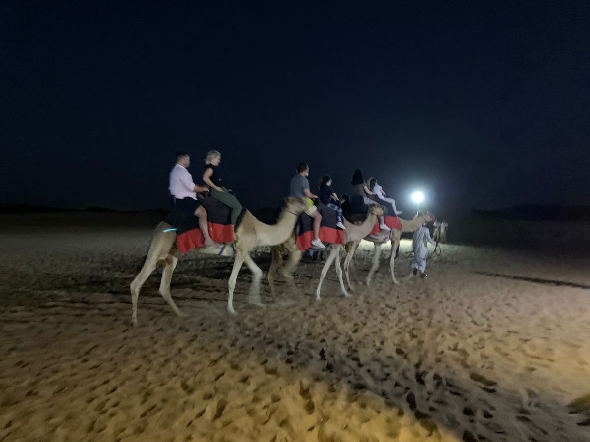 食事会場に着いた時はすでに暗くなり始めていて、サンドボードをしたいと並んでみましたが、なかなか順番が回って来ず。あきらめてラクダに乗ることにしましたが、ラクダ使い?のおじさんがスマホで写真を撮ってくれたのですが、後でお金を請求され、写真は逆光、ピンボケでした。食事の席も早い者勝ちなので、サンドボードやラクダに乗っていると良い席はなし。結局、座れずに立って食事しました。お料理もイマイチでしたが、早々になくなってしまいました。