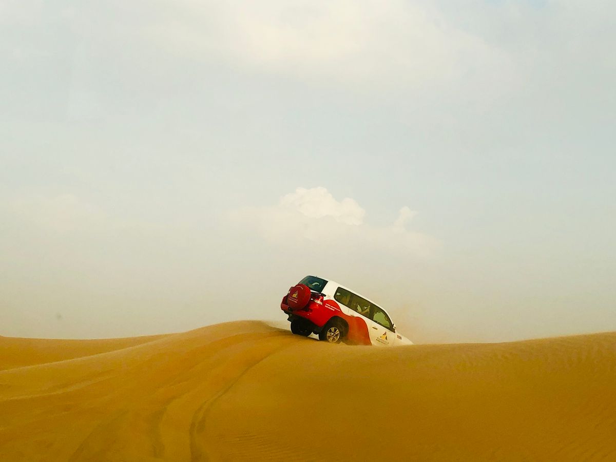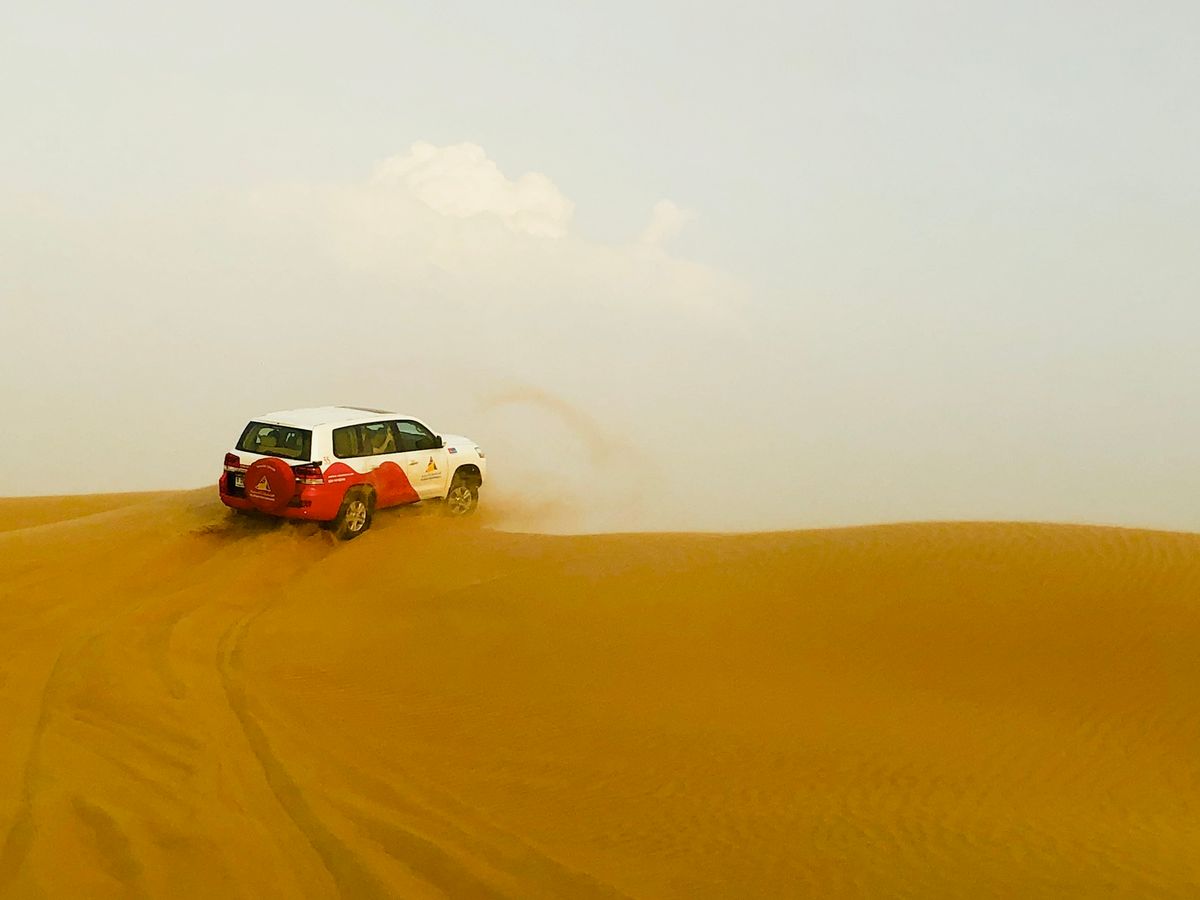 ランクルに6人位乗り合わせて砂漠ドライブ。予約前は自分で運転したいと思ってましたが、やはりプロに任せた方が激しさを体感出来ると思います。
