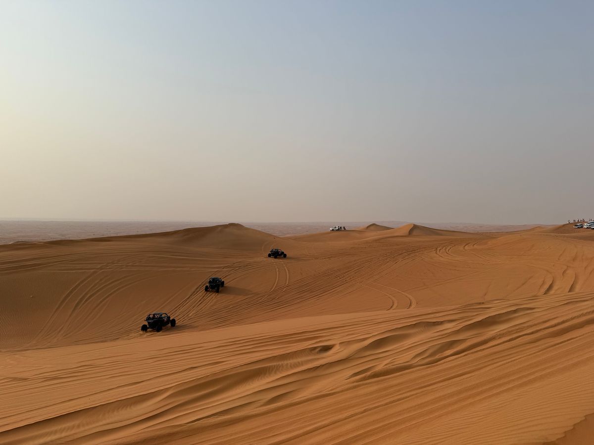 ツアー客は多数参加し、自分が搭乗した車には全員日本人だった。ドバイの繁華街を抜けると、そこは更地というか砂漠地帯だった。一向はバギー場があるサービスエリアみたいな場所へ立ち寄った。そこは周辺は砂漠で何もない場所である。しばらく休憩したら、砂漠を縦横無尽にドライブするのであった。砂漠に入った途端、最初は轍を通って進んでいたが、途中から轍がない場所へ進み、車内が揺れた。まるでジェットコースターに乗っているような感覚であった。正確にはレールのないジェットコースターだった。何処に進むのかはドライバー次第である。途中、写真スポットで撮影した際、周辺はまるでスターウォーズの世界と間違ってしまうような感覚だった。その後はBBQ会場へ向かい、途中でラクダ牧場に立ち寄った。