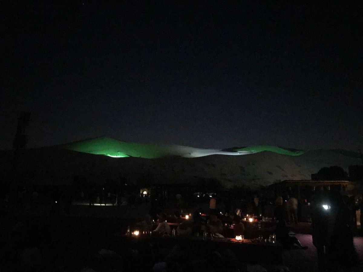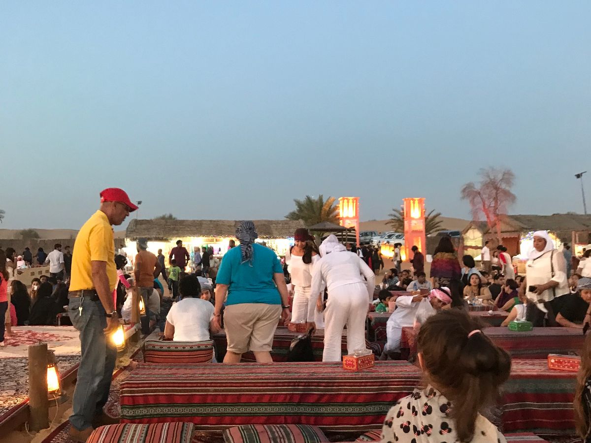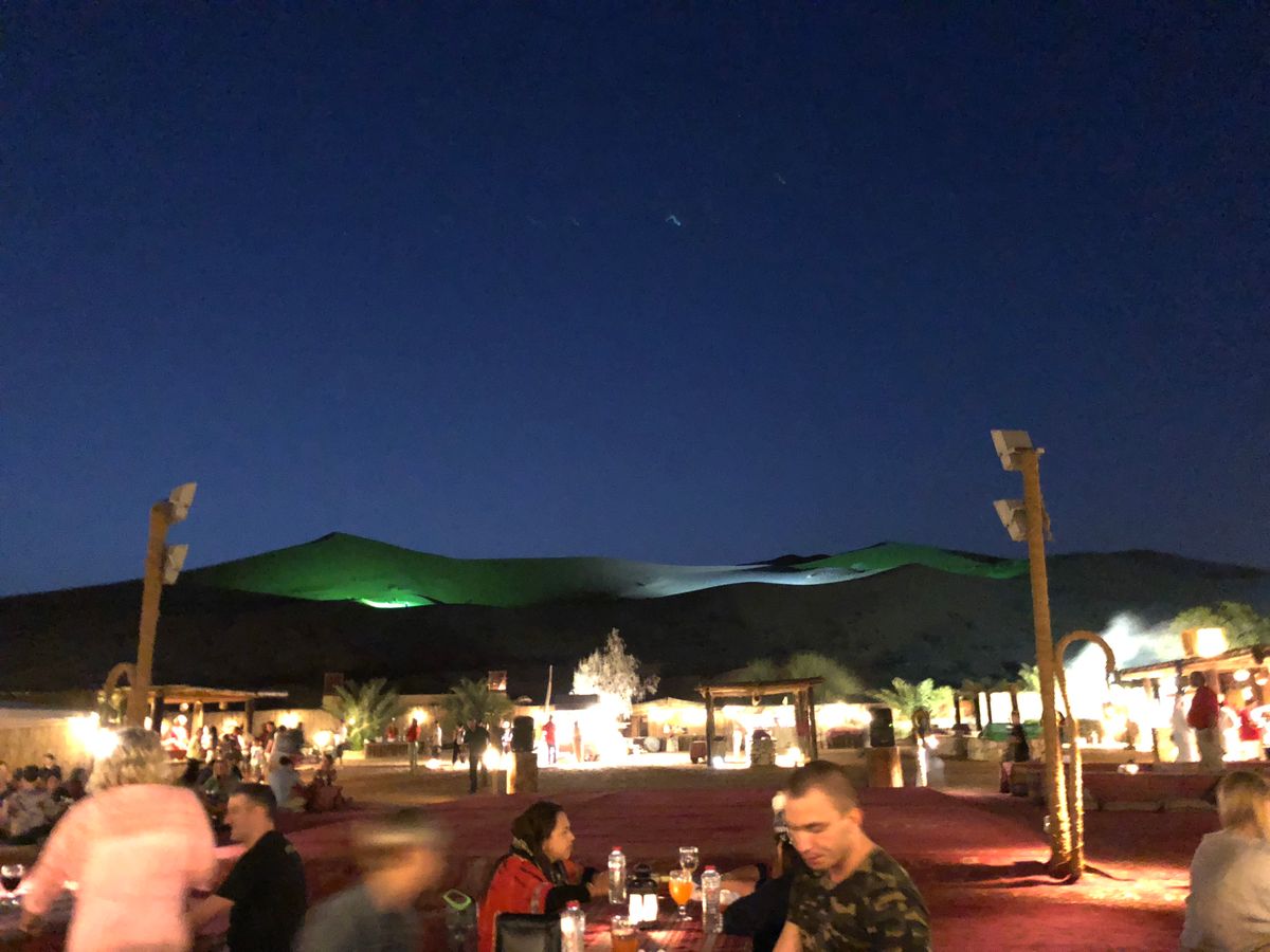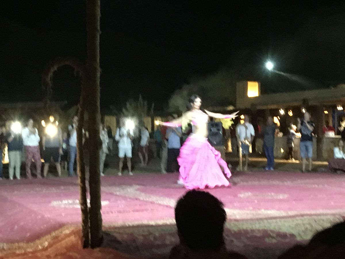 初めて見る砂漠。まだまだドバイは開発の余地があるように思えた。今回、7歳の孫がいるのと家内が車に酔いやすいのでプライベートツアーとして申し込みました。ピックアップ場所がホテル玄関といっても広く、ドライバーの目印もわからないのでコンシェルジュにスマホのバウチャーを見せたら連絡をとってくれて車まで案内してくれました。個人ツアーなので英語理解力は必須ですが、発音になまりがあるので注意が必要です。さて、ドバイ市内から1時間時速約100㎞で砂漠入口に到着です。眠っていた孫も興奮してキャアキャアでしたが、家内は怖がりなので冷や汗たらたらでした。夕食は、ドライバーがキャンプといってましたが砂漠の中の特設場所、星空の下のまさにキャンプてした。食事は、ベリーダンスショーの前後に合図があり一斉に並んで手に取ります。システムがわからなかったからかドライバーが早めに教えてくれたので前の方に並べましたが行列ができかけてから走ろうと思っても砂の足元では…。ビーチを考えていただければ…。事前に食事を準備することが出来るようなのでその方がいいかもしれません。アルコール類は別料金で現地支払い。500mlのビールが35デルハム、約千円ちょっと、高いです。帰りは1時間かけてホテルへ。朝到着で15時半のツアーでしたが、翌日にした方が良かったかもしれません。