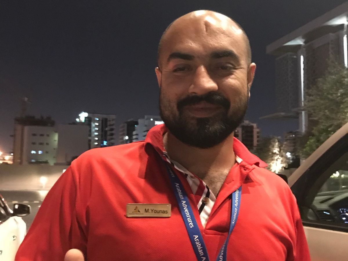ピックアップ時の時間も正確で、笑顔で自己紹介してくれました。私たちのガイドはM.Younasさんでしたが、砂漠までの間もドバイの主要な名所をくまなく説明してくれました。車内では冷たいミネラルウォーターも用意されています。ラクダレース場を経て砂漠へ入るとハヤブサ狩ショーを見学。その後はお楽しみのデザートサファリ。ランクルの空気を抜いて砂漠を駆け巡ります。ヨウナスさんの運転テクニックは最高で車内がエキサイティングになりました。