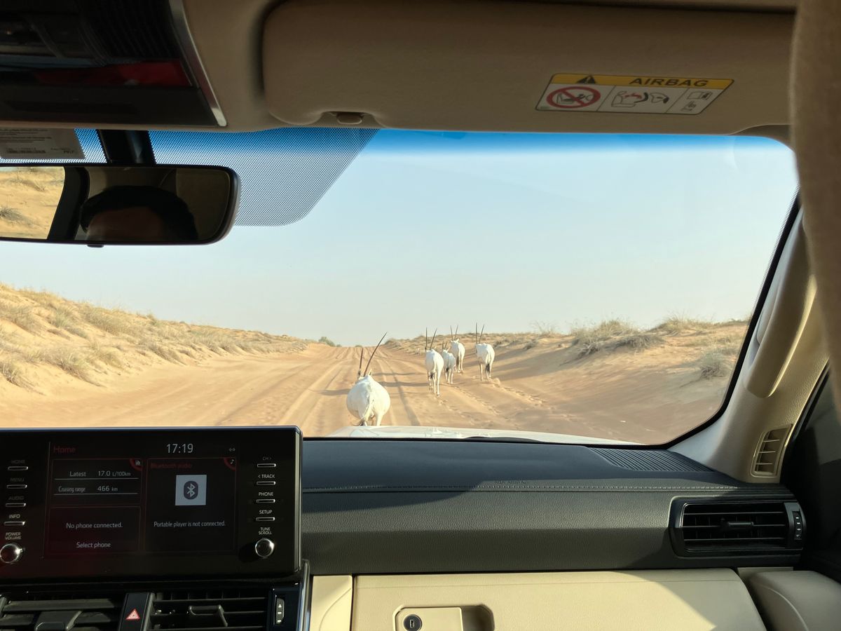 砂漠に入ってすぐにアラビアンオリックスやガゼルなどの動物たちに出会え、大盛り上がり。この動物保護区は国営なので、車で入れるのはArabian Adventures社のツアーのみです!