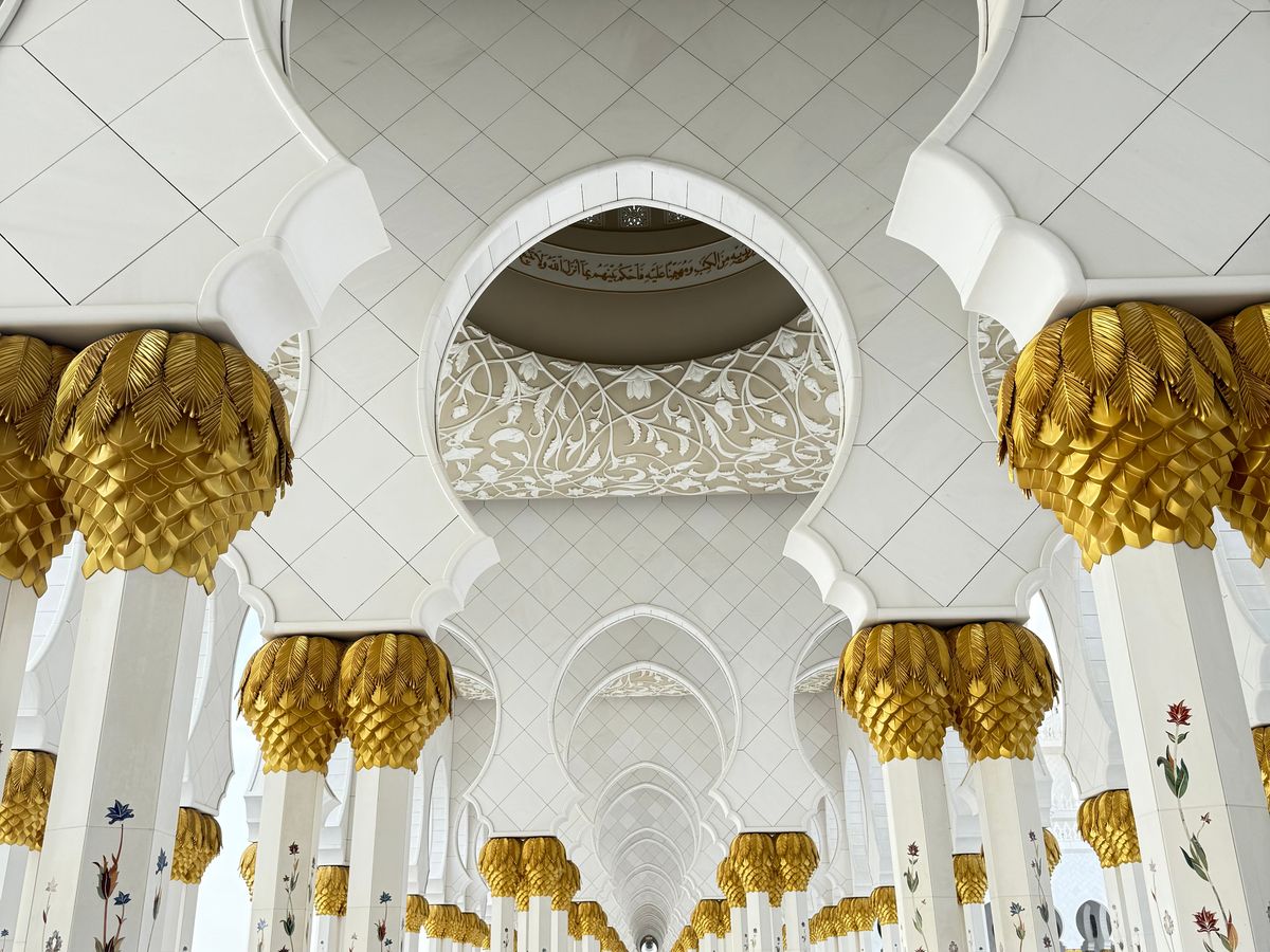グランドモスクに到着。地下アーケードを通ってモスクに入ります。入り口の前に入場券(無料)を登録するQRコードがあるので、登録完了し、いざ入場。モスクは真っ白でとても美しかったです。外観もさることながら、内観も素敵でした!モスクにある1096本の柱は大理石のプレートにラピスラズリ等の半輝石でお花の模様があしらわれていて、とても素敵です。有名なシャンデリアや絨毯も圧巻でした!90分の見学時間でしたが、3時間くらいかけてもっとゆっくり見たかったです。服装に気を使ってTシャツ・パーカー・ジーパンで行ったのですが、アバヤを購入すれば良かったなぁとちょっと後悔しました。