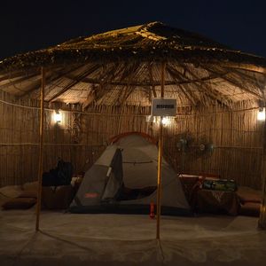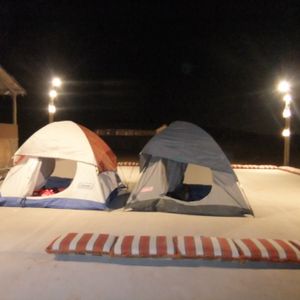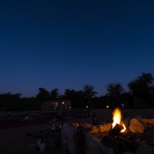 食事はキャンプ地の絨毯が敷かれた中央のテーブルで摂るようになっており、夕食のBBQをガイドの方が次々と焼いて持ってきてくれました。ただテーブルにはかすかな灯りしか無く何を食べているのかほとんど見えなかったです。食事中だけでももう少し明るいと嬉しかったです。テントはベットと荷物置きがある程度ですが寝るだけならば十分でした。深夜は虫?の鳴き声程度の静かさでよく眠れました。夕食後はキャンプファイヤーと水たばこ体験もありましたよ。