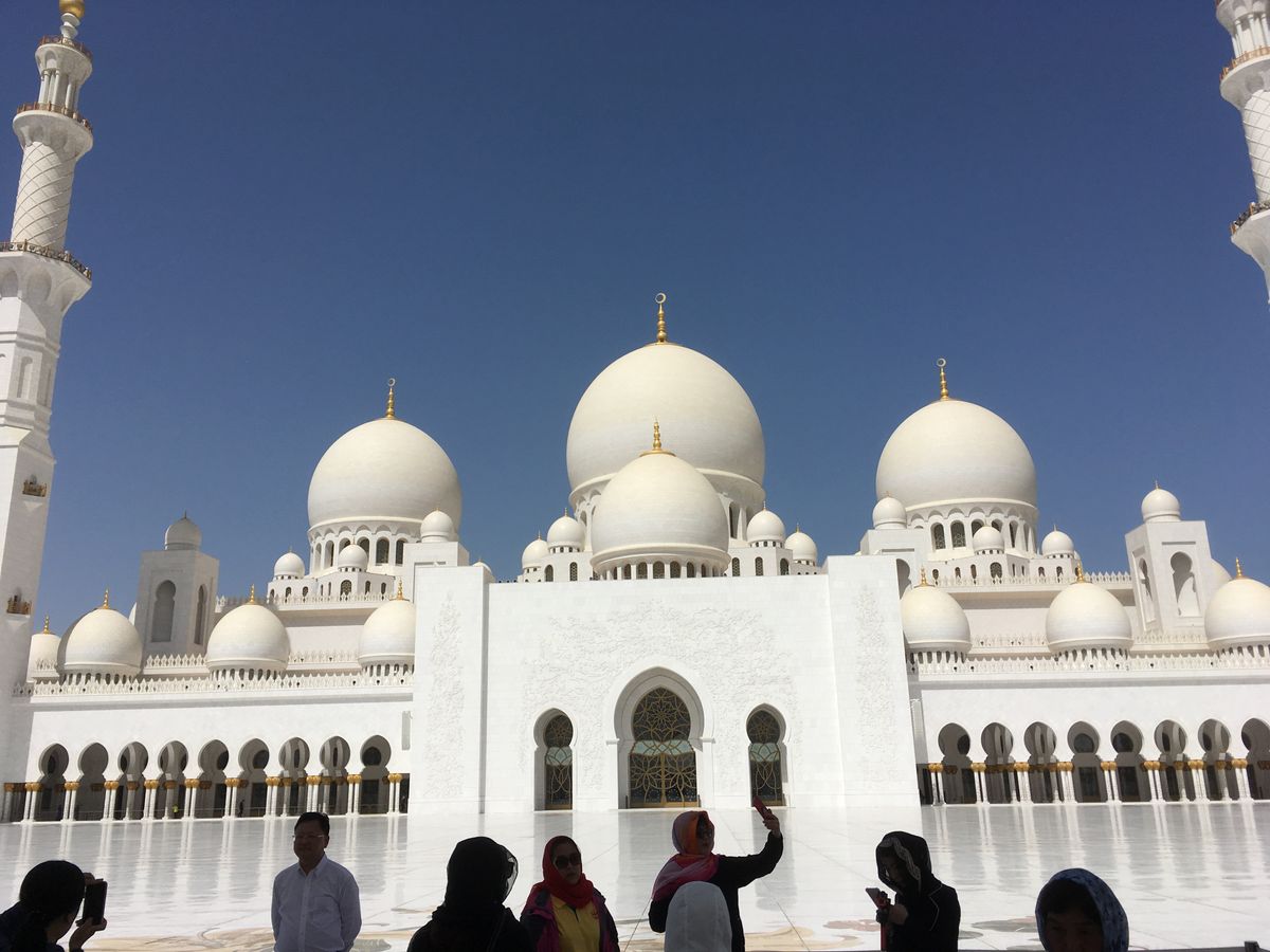 空港並みのセキュリティチェックで、中に入ると真っ白な眩いほどのモスクは圧巻。床の大理石もカーペットも9億円のシャンデリアも素晴らしい!
