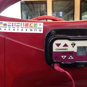 各座席にイヤホンジャックが付いていて、12の言語から選択します(日本語はチャンネル12)。イヤホンは最初に乗車するときにもらえますが、それ以降は同じイヤホンを使わなくてはいけないので、バスを降りるときに必ず持っていく必要があります。