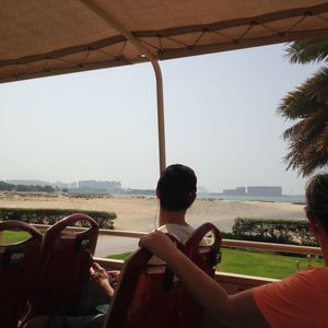 この日の気温は42度とかなり暑かった(ドバイの人にとってはそうでもないようです..)のですが、せっかくなので二階席のオープンスペースに座りました。二階席の前方はガラス張りでクーラーが効いているのですが、殆どの観光客がオープンスペースにいました。生ぬるいというか熱いドバイの風に吹かれながら、バージュ・アル・アラブやマリーナ地区などのドバイの観光スポットを巡りました。