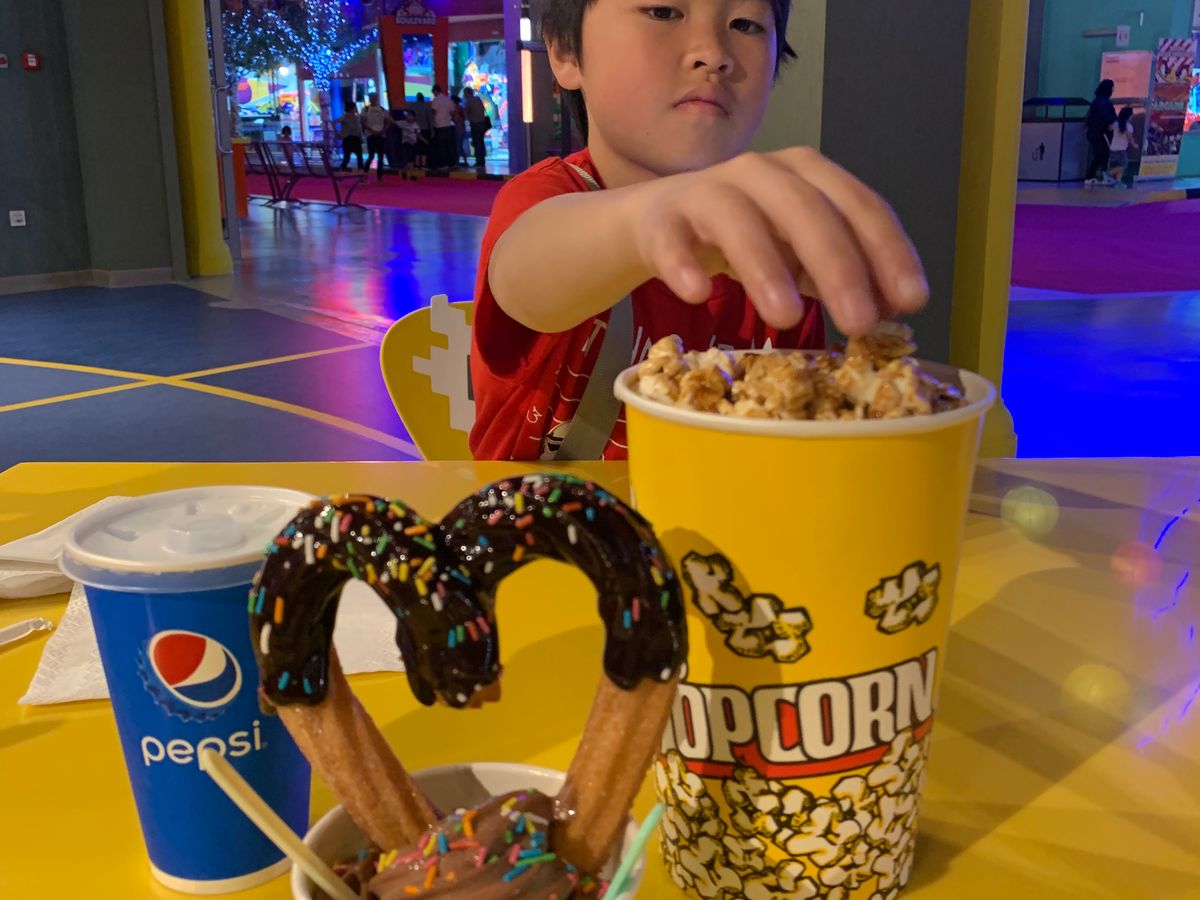 私達が行った時は貸切で、自由に席を座ることができました。まずは、チェックインをします。そして、好きな飲み物と、ポップコーンかクッキーを選ぶことができます。私達はポップコーンと飲み物を頼んで、いざ40メートルの世界へ行きました。写真映えはポップコーンの方がします。笑