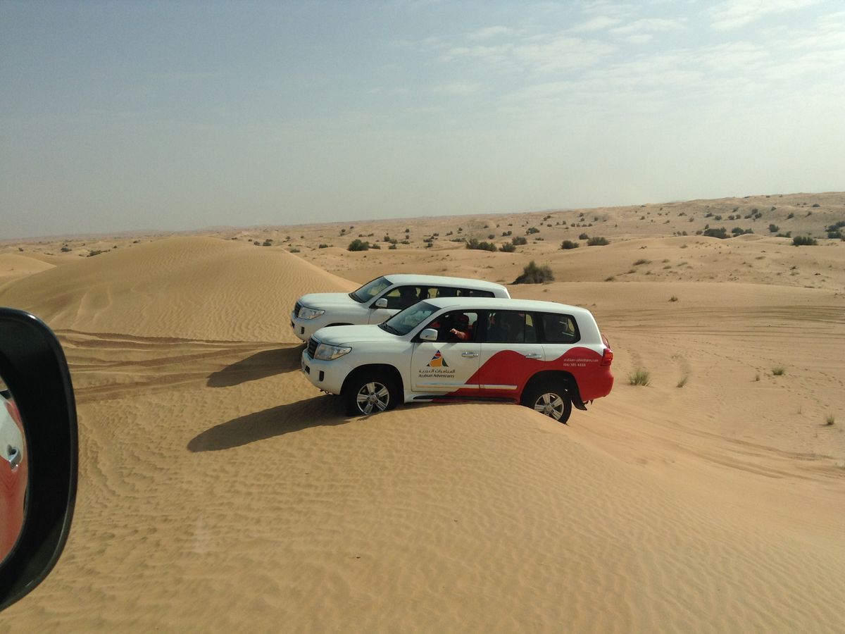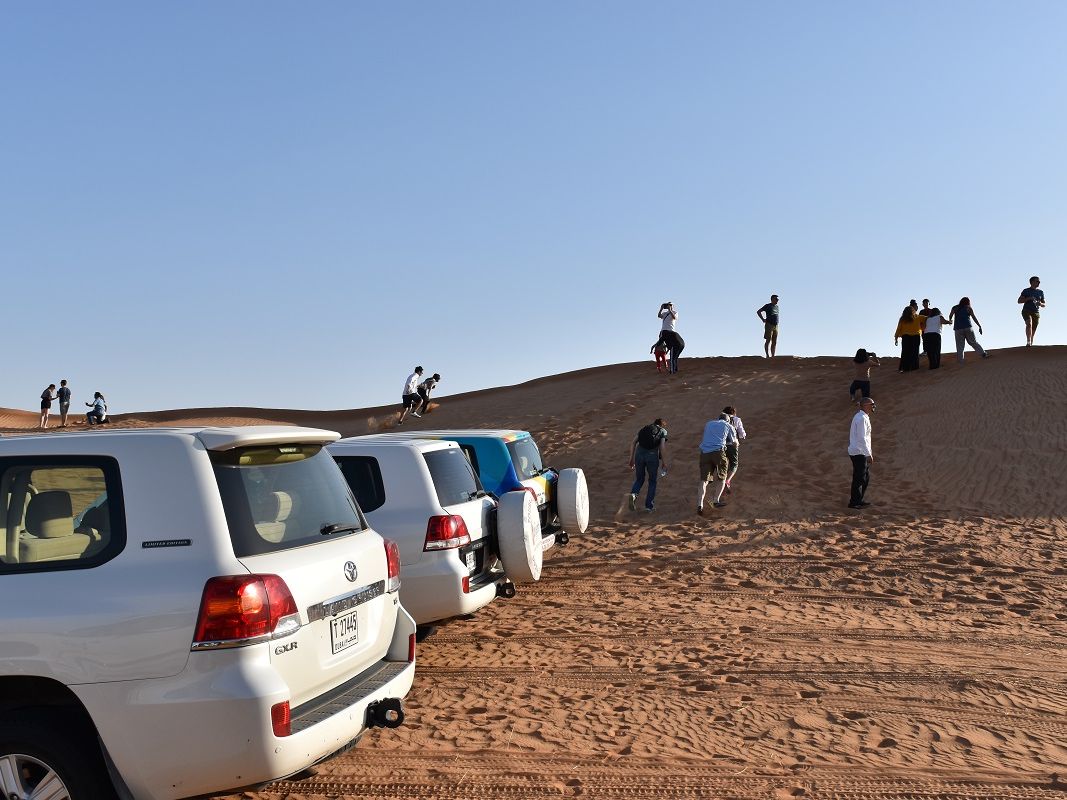 5:00着のフライトで利用しました。ディナー付きのツアーと迷いましたが、夕方から夜はバージュカリファを優先してモーニングデザートサファリを選びました。集合場所のホテルは第一ターミナルから近いですが、グーグルストリートビューで見る限り歩いて行けそうもなかったのでタクシーを利用。ホテルのウェブサイトに価格30ディルハムと記載されています。タクシーでも地図上の距離よりはだいぶ遠回りになります。8:00ピックアップで空港周辺は朝の渋滞時間帯でしたが、途中ドバイアウトレットモールやラクダのレーストラックなどを横目に1時間弱で広大な砂漠の入り口に着きました。一旦車を止めて他のツアー車両と合流し、砂漠走行用にタイヤの空気圧を下げてデューンドライブが始まります。ランクルのタイヤにはラクダのマークが付いていました。最初のうちは整地された道路を移動しますが、途中から砂丘に入ると本当にローラーコースター以上のスリルが味わえます。ランクルはマニュアルトランスミッションで1速から3速位までを使いますが、砂丘の急勾配急カーブを片手ハンドル片手シフトノブで運転するドライバーさんとランクルの凄さを思い知りました。途中見晴らしの良い所で小休止したあと、再スタート後に2台がスタックして救出するハプニングをへて、次のアクティビティ会場へ移動します。トイレ休憩の後、ラクダライドとサンドボードを体験できます。個人的にはランクルよりもラクダの方が落っこちそうで怖かったです。その後ブランチボックスとドリンクで遅めの朝食になりました。普通の朝食後にデューンドライブは危ないと思います。食事終了後はピックアップホテルまで送ってくれて12:30過ぎに解散となりました。その後15:30からのバージュカリファの展望台を予約していたので、メトロやトラムで少しウロウロして16:00頃に展望台に登りました。夕日を見て下に降りてドバイファウンテンを見てからモールで買い物をして空港に21:00頃に戻りました。長時間のトランジットを満喫することができました。ディナーサファリに比べると参加人数も少ないと思うのでオススメです。