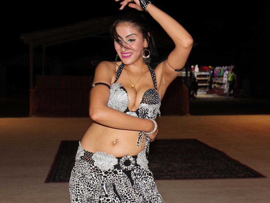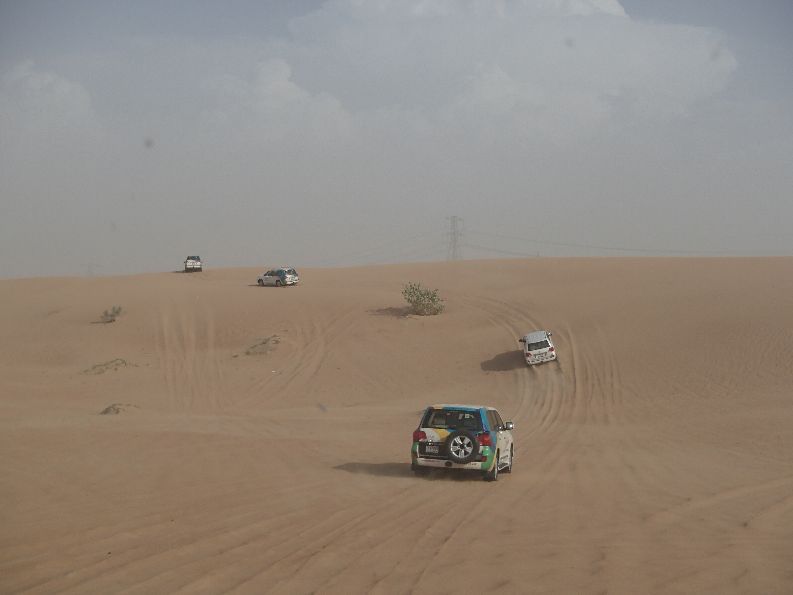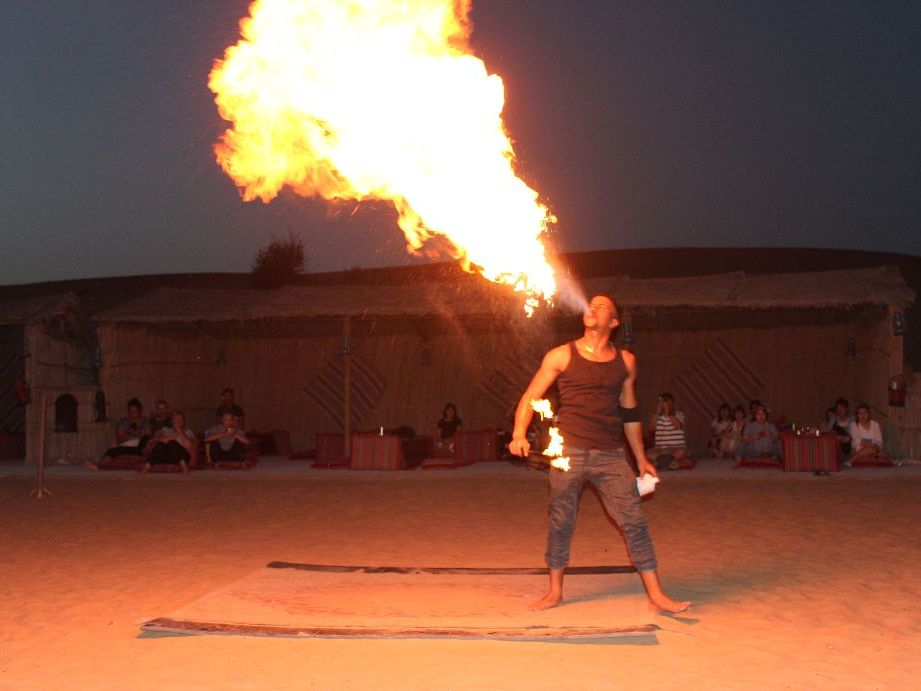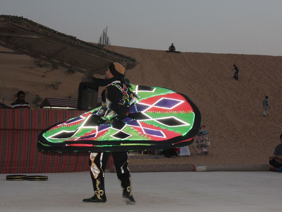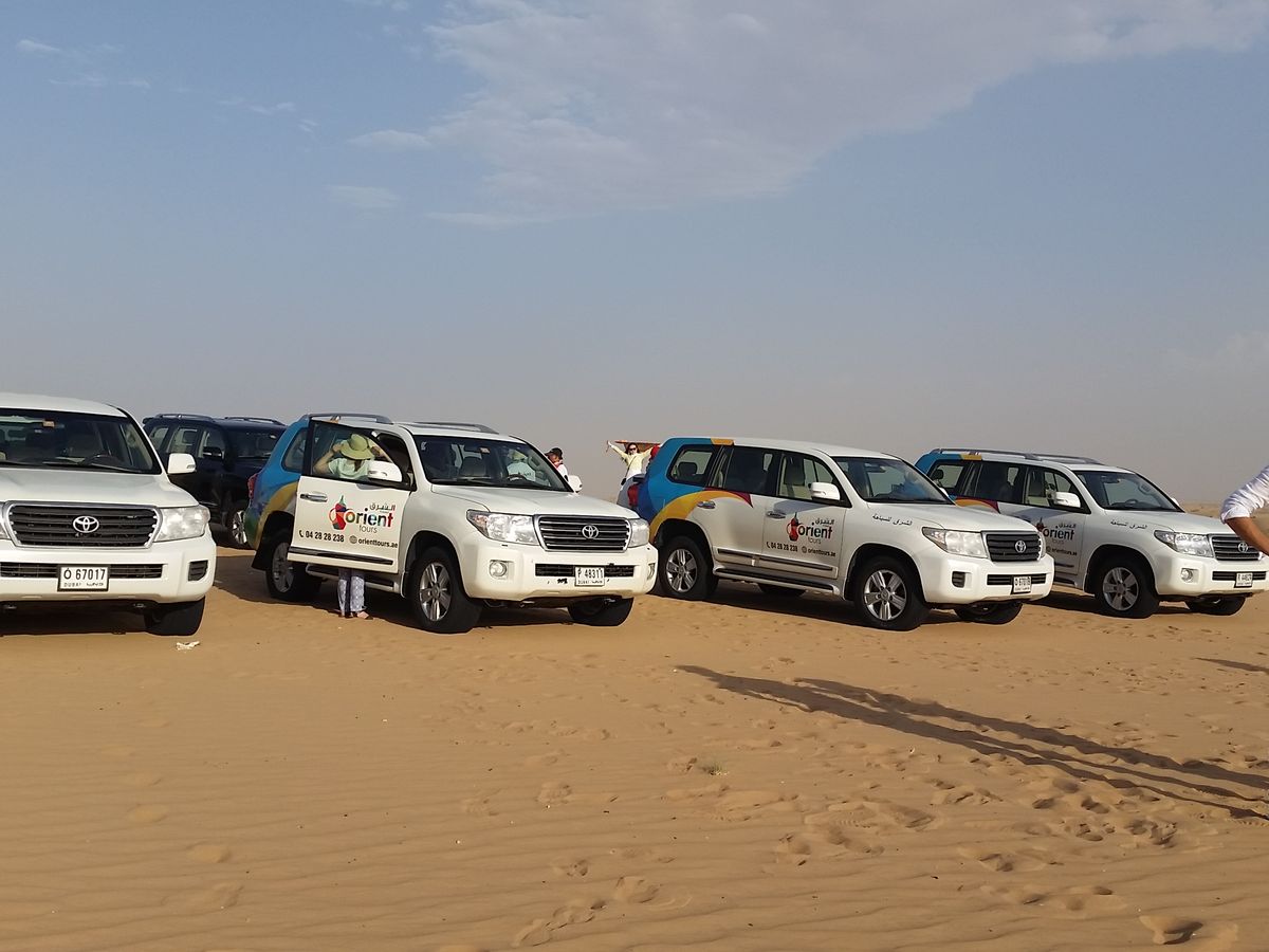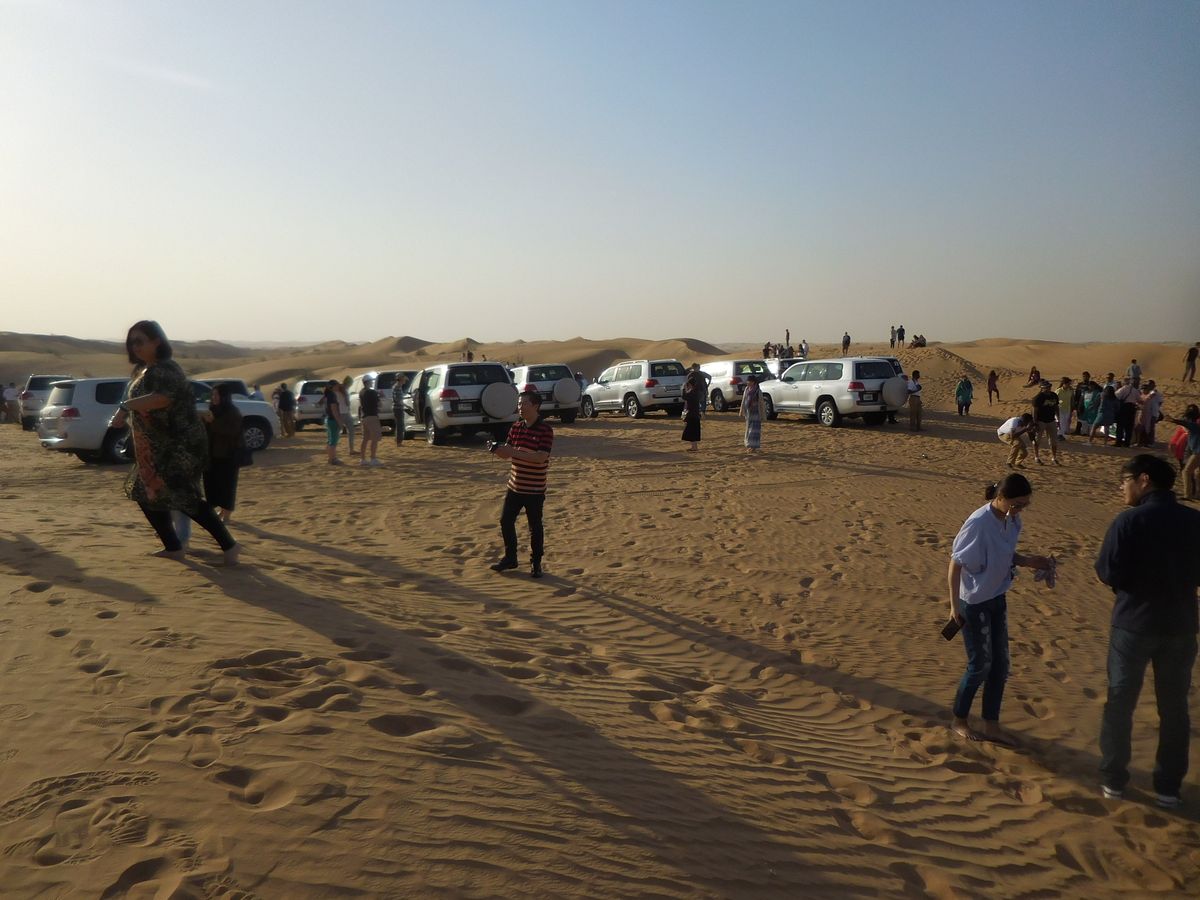 この日の参加者は、4組11人。午前中は日本人ガイドと共に歩いてゴールドスーク、スパイススーク、アブラ船に乗って対岸に渡りオールドスーク、そしてドバイ博物館を見学する。昼食はホテルのレストランでとるが昼食としては少し高い(150AED/2人は必要)。その後、バスタキア地区を見学し午後のサファリデザートへ引き継がれる。サファリデザートは、3台のトヨタ製ランドクルーザに分乗し、インド人ドライバーの運転する車で2時間程郊外へ移動する。そして、砂漠の中に入り、しばらく行ってオリエントツアー車が20台ほど一同に集合する。ここで空気圧を調整した後、隊列をなして砂漠の中へ突入し、デザートサファリが始まる。砂漠の凹凸を利用し上ったり下ったりしてスリリングな運転で乗客を楽しませてくれる。これが30分くらい続く。その後、キャンプ地へ移動し、ラクダ試乗、水タバコ、ハヤブサの手乗り、タトゥー等が楽しめる。夕日が沈むと民族ダンス、火を噴くパフォーマンスその後、バイキングでBBCをいただく。最後はベリーダンスと美女のアラビアンナイト風の踊りと続く。帰りは宿泊ホテルの地域で車への分乗が再度割り振られホテルまで送ってくれる。