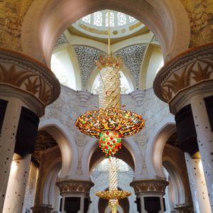 さて服装チェックをパスすると、抜けるような青い空に 太陽の光に照らされて真っ白に輝くモスクがそびえ立ち、一瞬目を疑うような美しすぎるモスクです。入場した途端に目が奪われます。内装も美しいく、館内に敷き詰められた世界最大の手織りカーペットはペルシャ絨毯で。1300人の職人さんたちの手によって織られたそうで圧巻な出来栄えです。カーペットの踏み心地は滑らかでフカフカ。全てスワロフスキーで出来たシャンデリア。壁には大きなイスラム時計に一日5回行うという礼拝の時間がデジタル表示されていています。何時でも何処でも、聖地メッカの方向まで教えてくれるという至れりつくせりです。