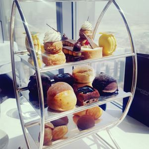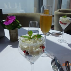 アフタヌーンティーで行きましたが、前菜、主菜、デザート。いわゆるスコーン、ケーキ等のみがアフタヌーンティーと想像してたので、お腹一杯になりました。もちろん美味しかったです。ウェルカムドリンク付きで、バウチャーにはアルコール含まず、とありましたが、シャンパン1本が無料でした!たぶん、遊覧飛行のヘリコプターだと思いますが、我々はそれよりも高い位置で食事しているのが、驚きでした。トイレの手洗い場がガラス張りで、ドバイモールを見下ろす、これまた、絶景ポイントでした。