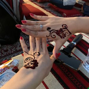 サラサラ砂の広大な砂漠に日が沈んでいく様子はきれいでしたし、ファルコンもかわいらしかったし、ヘナタトゥなどのアクティビティもほんの少し待つだけで体験できました。