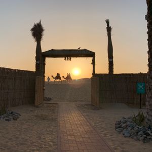 ホテルにピックアップに来たガイドさんがまずしょっぱなに「予約は大人2人になってるよ。子供がいる事は聞いてない」と怖い顔して言いました。実は冗談なんだけど、顔が怖いので冗談に聞こえずびっくりしました。車に乗り込んだらそのまま砂漠に向かいます。私達はフランス人家族と一緒でした。途中で英語でドバイの事を教えてくれます。道から外れた所にツアー参加の車が何十台と停車していてトイレ休憩中に車のタイヤの空気を抜きいよいよ砂漠ドライブです。アトラクション並みに揺れますが、酔い止め薬を飲んでた子供は平気そうでした。途中ガゼルやオリックスなどの動物にも会え、サンセットを見ながら写真撮影。誰も足を踏み入れてない砂の上に何かの生き物の足跡…何の生き物かに思いを馳せて息子は大興奮!キャンプではキャメルドライブ、ヘナタトゥーをしたり主人は水タバコを試して過ごしました。食事も美味しく、意外にもビールが冷えてて美味しかった。キャメルドライブは小学低学年なら3人まで一緒に乗れるようですが、ラクダをひくおじさんが写真撮ってくれた後、周りを気にしながらチップを要求してきました。仕方ないからほんの少しのチップを払ったけど、文句言わなかったからチップ要求自体が禁止だったのかも…でもこのおじさんが写した写真はとてもヘタクソでした。ベリーダンスもありましたが、私達はこの間に民族衣装を着て写真撮影しました。結構高かったですが、もう2度とは来れないかなと思い奮発しました。周り一面の砂漠、裸足で歩くとサラサラとしてとても気持ちよかったです。絶対に行く価値ありです。