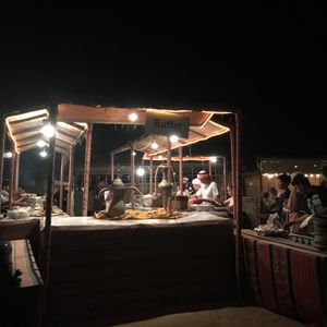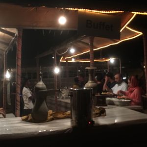 太陽が沈んだ後は食事が出来るような場所に移動。そこでラクダに乗り、水タバコ・ヘナ・ベリーダンス等があります。食事は中東の食べ物なのか配給式みたいに一列に並んで係りの人がお皿に入れてくれます。最初の前菜とその後のメインの肉料理との間が空きすぎたのと肉以外口に合いませんでしたがこれも経験と思い頑張りました!(笑)料理に関してはあくまでもついてくるものと思っていたほうがいいですね。