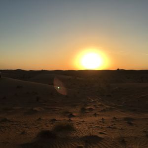 車で1時間ほどで、ドバイの市街地とは対照的に、目の前一面に広がる砂漠が、別世界のようでした。砂漠のサラサラな砂にも感動。夕暮れ時には、沈む夕日を見ながらロマンチックな時間を過ごせました。ガイドさんも、とても親切で写真をたくさん撮ってくれました。さすが撮影ポイントを知っていて、どれも素敵な写真ばかりでした。砂漠へいくまでのドライブは、すっごくエキサイティング。急勾配がすごいし、かなり揺れるから、車酔いの心配があったけど、そんなことを忘れるくらい楽しめました。こんなドライブは、他では味わえない体験と実感しました。キャンプ地では、ラクダに乗ったり、夜空の下でBBQを食べたり、12月の夜の砂漠は、かなり寒かったけど、昼とは違う夜の砂漠も素敵でした。真っ暗な中で見る星空やペインティング、水タバコなどアクティビティも満載。英語ガイドのツアーだけど、英語がわらかなくっても全然大丈夫。十分に楽しめます。ほんとに、充実した内容のツアーで素敵なアラビアンナイトが体験できない、最高でした。次回、ドバイに来たら、また参加したいなぁと思います。次回は、砂漠に一泊っていうのも有りかなぁと。