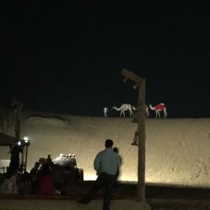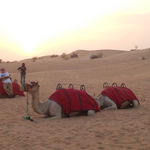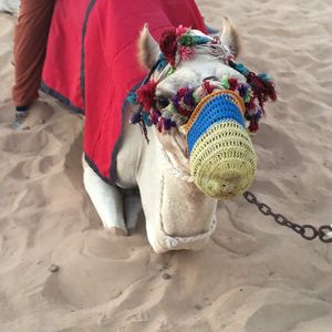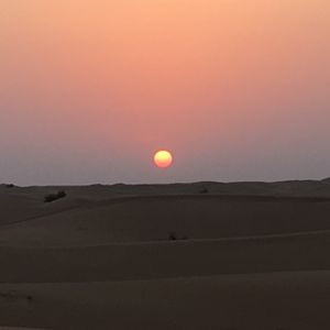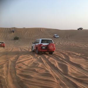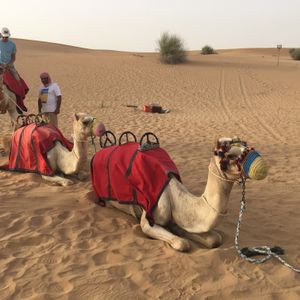 ホテルロビーに15時となっていましたが来ないのでここでいいのかと不安でしたが、15:30くらいに迎えが来ました。四駆で他の2組4人ともみんな日本人でした。途中ガソリンスタンドに寄りトイレ行ったりして出発。砂漠に着いてすぐ3分くらい?写真撮影タイム。それから砂漠のがたがた道を登ったり下ったりのドライブ!ネットの体験談で車酔いした人がいたとの事だったので、普段そんなにしませんが念のため酔い止めを飲んで行きました!でも、思っていたより全然揺れは激しくなかったです。隣の人に勢いでぶつかるような事もなかったし。途中、柵の中にラクダがいるところに止まり写真撮影。その後またしばらく車で進みキャンプ地へ日没少し前に到着。すぐラクダ乗りスタート!一頭に2人ずつで3頭連なって一周します。かなり短い距離です。夕日バックでラクダに乗っているところを写真撮りたかったのですが、列にすぐ並ばなかったため、乗る時には沈みかけでした。あと、他にもヘナタトゥー、水タバコ、アバヤの貸し衣装、サンドボード、サンドアート販売と色々あって楽しみにしていたのですが、先にサンドアートのところに行きしばらく見ていたり自分のを作ってもらったりしていると、気づけば暗くなりだしてきて、他の催しが終わっていた‼︎( ̄◇ ̄;)砂漠で夕日バックで写真もとりたかったのにそれすら出来ず...本当に残念でしたT^T 完全に順番を間違えました‼︎ しかも、サンドアートの販売だけは最後までやっていたので(ー ー;)