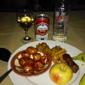 食事はアラブ料理のビュッフェで、お肉は1種類ずつ係の人がお皿にのせてくれます。ソフトドリンクは飲み放題。アルコールは有料です。