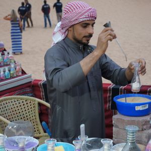 サイトは円を描くように、サンドアート(売店)、シーシャ(水タバコ)、ヘナ、ちょっとしたお土産物屋さんがあります。事前にアラブ衣装を申し込んだ場合は、係の人が呼びに来てくれますが、突然やって来てそのまま建物の裏に呼ばれるので、心配な人は荷物を持って行ったほうがいいと思います。私たちの場合は近くに同乗のオーストラリア人一家がいて「(荷物を)見ていてあげるから大丈夫」と言われました。