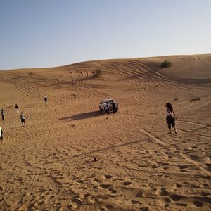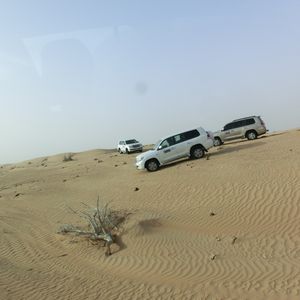 同じホテルの宿泊者2名と出発。ドバイ市内から一気に砂漠へ!同乗者のカップルが娘の写真を撮ってくれたり、ドライバーが民族衣装試着を勧めてくれたり…