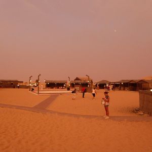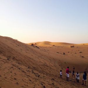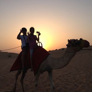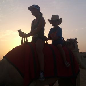 準備が整うといよいよ出発です。想像していた通り、いやそれ以上に砂丘を登ったり降りたり、そのたびに車が斜めになるし、砂は車の窓に吹きかかるしで、子供達は大はしゃぎ!8歳の長男もなぜか「GOOD JOB!」を連発してました。(生粋の日本人です)私も年甲斐も無く「キャーキャー」言ってました。もう、30分間スリル満天。途中ラクダファームに寄ってラクダに触れたり、撮影ポイントで夕日をバックに写真を撮ったりしました。
