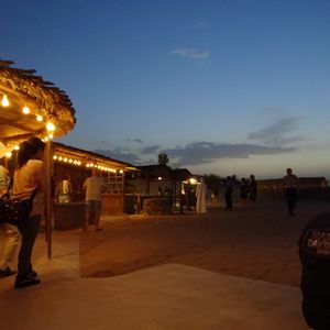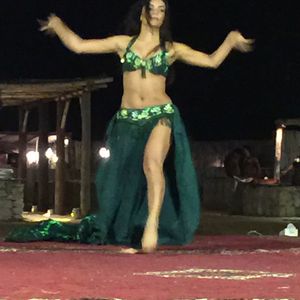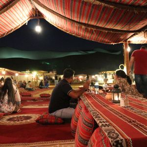 砂漠ドライブの場所から10~20分程移動したところにキャンプがあります。キャンプ前にラクダが3頭おり、他の観光客の方と交代しながら乗ることができますが、20mくらい進んで折り返しという非常に短い距離です。他にもバギー等のアクティビティがありましたが、子供が小さいのであまり経験できませんでした。キャンプに入ると、ドライバーさんが夕食のテーブルを教えてくれますのでそこで休憩できます(水は無料でしたが、ジュースは有料です)。1時間ほど待たされた後、「夕食の準備ができた」とのアナウンスがあり、各自で取りに行くというスタイルでした。バーベキューは1人2本まででしたが、その他のサラダやスパゲッティは基本的に食べ放題でした。アラビア料理に慣れていない家族はあまり箸が進んでおらず、結構残してしまいました。。。ショーは夕食を食べながら鑑賞する形でしたが、ベリーダンスと