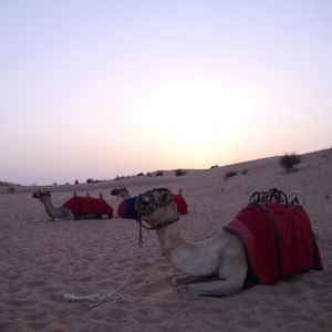 初めてのデザートサファリ体験です。家族5名での参加、車に弱い子、寝たら起きない子、寝たら起きない大人?での参加です。不安と興奮と入り混じる中、予定よりも15分も早く、お迎えの車が到着。(時間にルーズなインドとは大違い?)車は、砂漠走行も問題ない、5.7リットル V8エンジン搭載の大型RV。運転手さん兼ガイドさんから、大まかなスケジュールの説明を受け、いざ出発!まずは。集合場所のドライブインへ。7台の車連なって、いよいよ砂漠ツアーの開始と思いきや、ラクダさんと写真撮影です。砂漠の土の色が赤いのにビックリ。ラクダさんは涎がタラタラ・・・・?さ-、シートベルトを締めて今度こそ出発。ふと、振り返るとなんと末っ子は熟睡状態、一度寝たら起きない子、どうなることやら、と心配している暇もなく、車は砂漠に突入です。いきなりのドリフト走行に子供たちはビックリ、前の車は横転スレスレ、砂漠の丘を急降下!ジェットコースター以上のスリルに家族全員が大喜びです?(一人忘れていました。末っ子は熟睡状態)7台それぞれの運転手さんがオリジナリティのあるルートを選択し、右に左に、大揺れ状態、すると末っ子が目を覚ましたらしく一言、「なんで車が揺れてるの?」家族全員で大爆笑です。約30分の砂漠走行が完了し、夕食会場に。夕食はラムとチキンのバーベキュ-です。大自然の中で堪能する料理は味以上に、雰囲気満点でした。22:00にホテルに到着。心配した車酔いもなく、家族全員満足のデザートサファリでした。運転手さんありがとう!