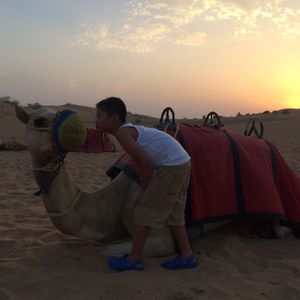 思ったより長めのドライブの後、今度はラクダ牧場?そしてラクダライド♪立ち上がるとすごく高くてビックリ!慣れない動きにビビりながらも貴重な体験ができました。そしてサンドアート(販売←購入しました。)や水タバコ・ヘナタトゥー・アラビアンなダンスを楽しみ夕食はBBQ♪ベリーダンス鑑賞!子供は素足で同乗の男の子と仲良くなり砂漠で砂遊びに夢中でした。言葉が通じなくても子供たちはすぐに打ち解けちゃいますね!