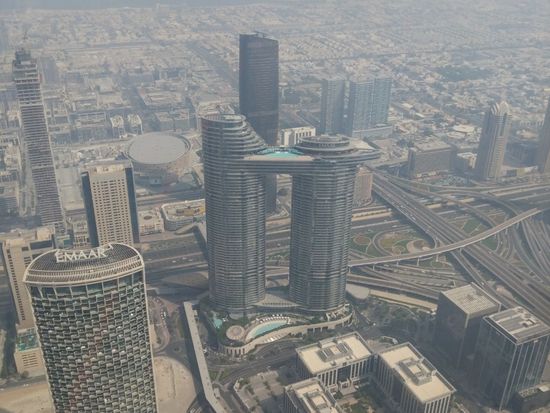 高速エレベーターで124階へあがると、眼下には高層ビル郡、内陸に目を向ければ砂漠が!360度絶景が楽しめる展望台です。屋外展望デッキに出ることもできます。