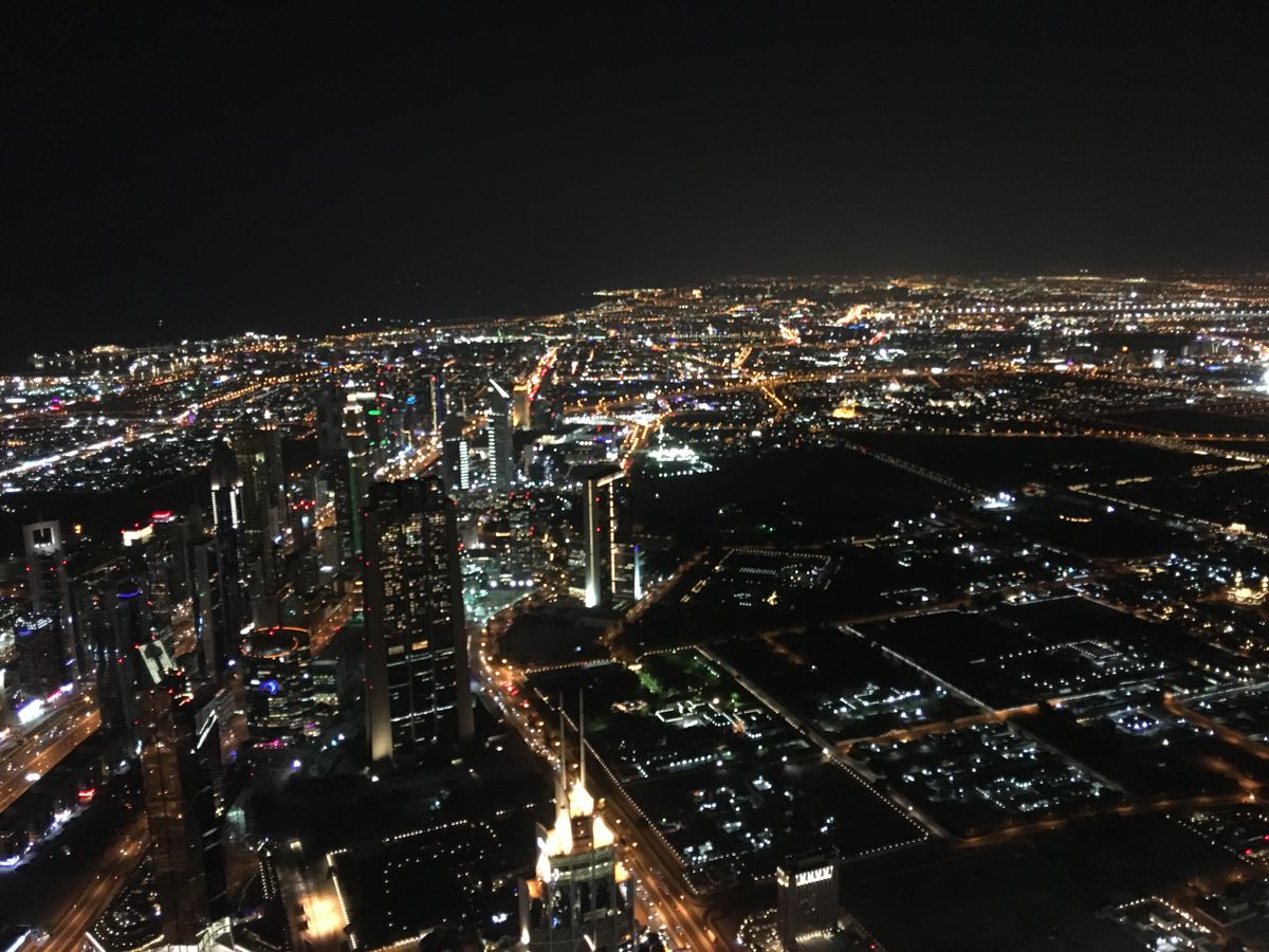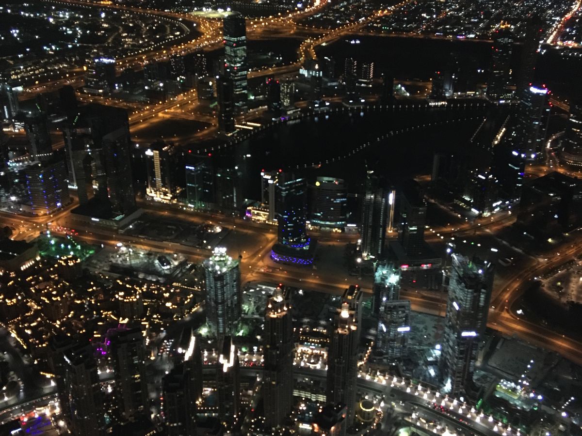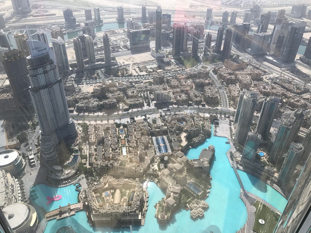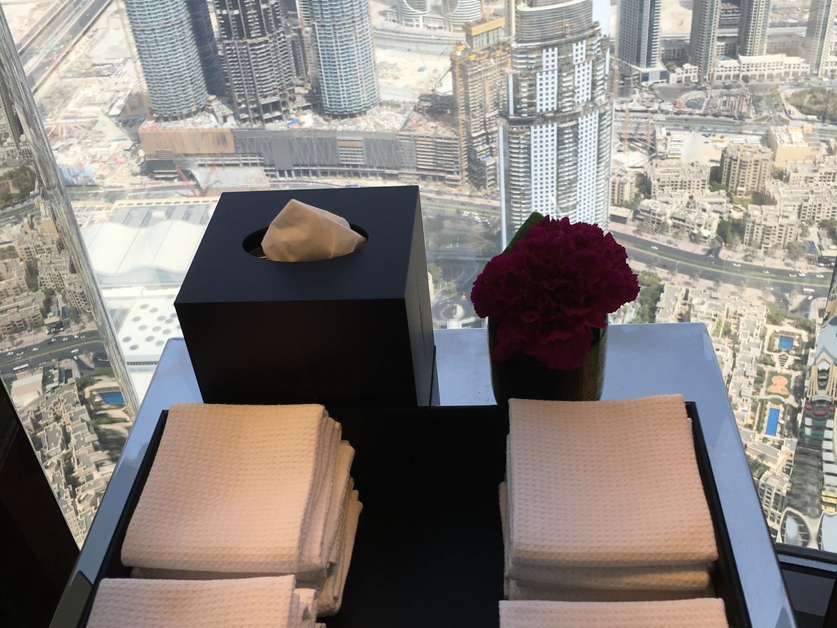 ラウンジへ到着。女性スタッフが案内してくれたテーブルは景色がクリアだったらベストでしたが、砂嵐でBurj Al Arab Jumeirahなど遠くが見えない日でしたのでDubaiファウンテンショーが見えるテーブルへ移動させてもらいました。真下にみえるダウンタウンははっきり見えます。まるでミニチュアタウンのようでした。