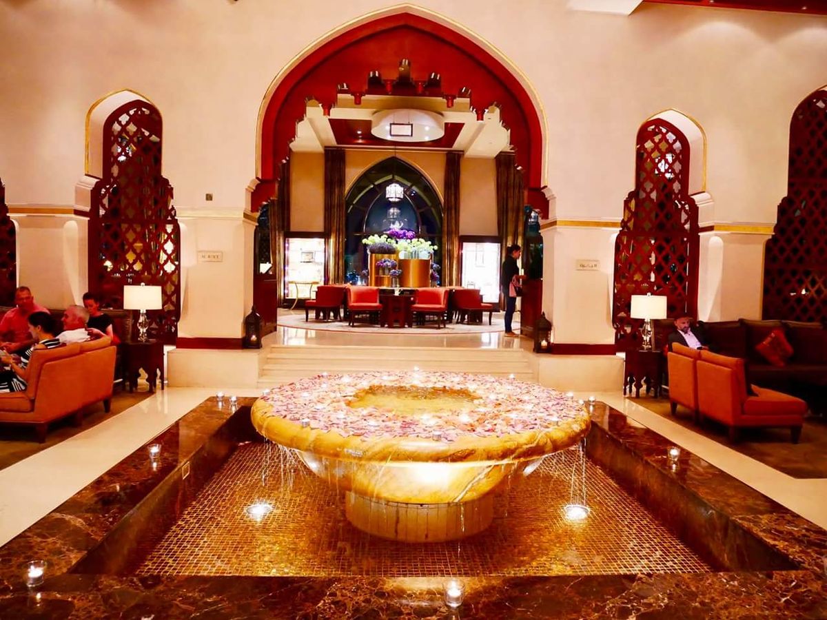 ホテル内に入りましたら、地上階(このホテルはロビーが3階)ですので目の前の階段で2段下に下がるかエレベーターでG階へ降り、中庭のプールの横をバージュカリファへ