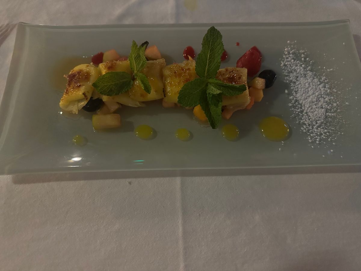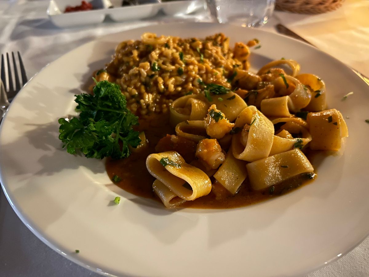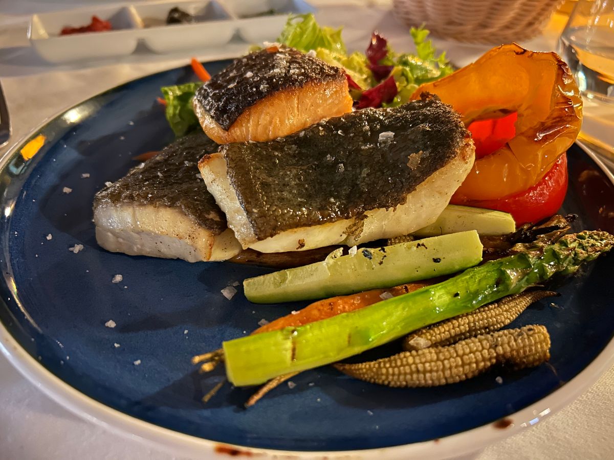 食事は、お魚のコースにしました。どれも美味しくて感動しましたが、前菜、パスタ、メインまで驚くほど量が多く、食べきれませんでした。店員さんが優しくて、メインのお魚をパックに包んでくださったので、デザートは食べきれました!ありがたや!!神様!!