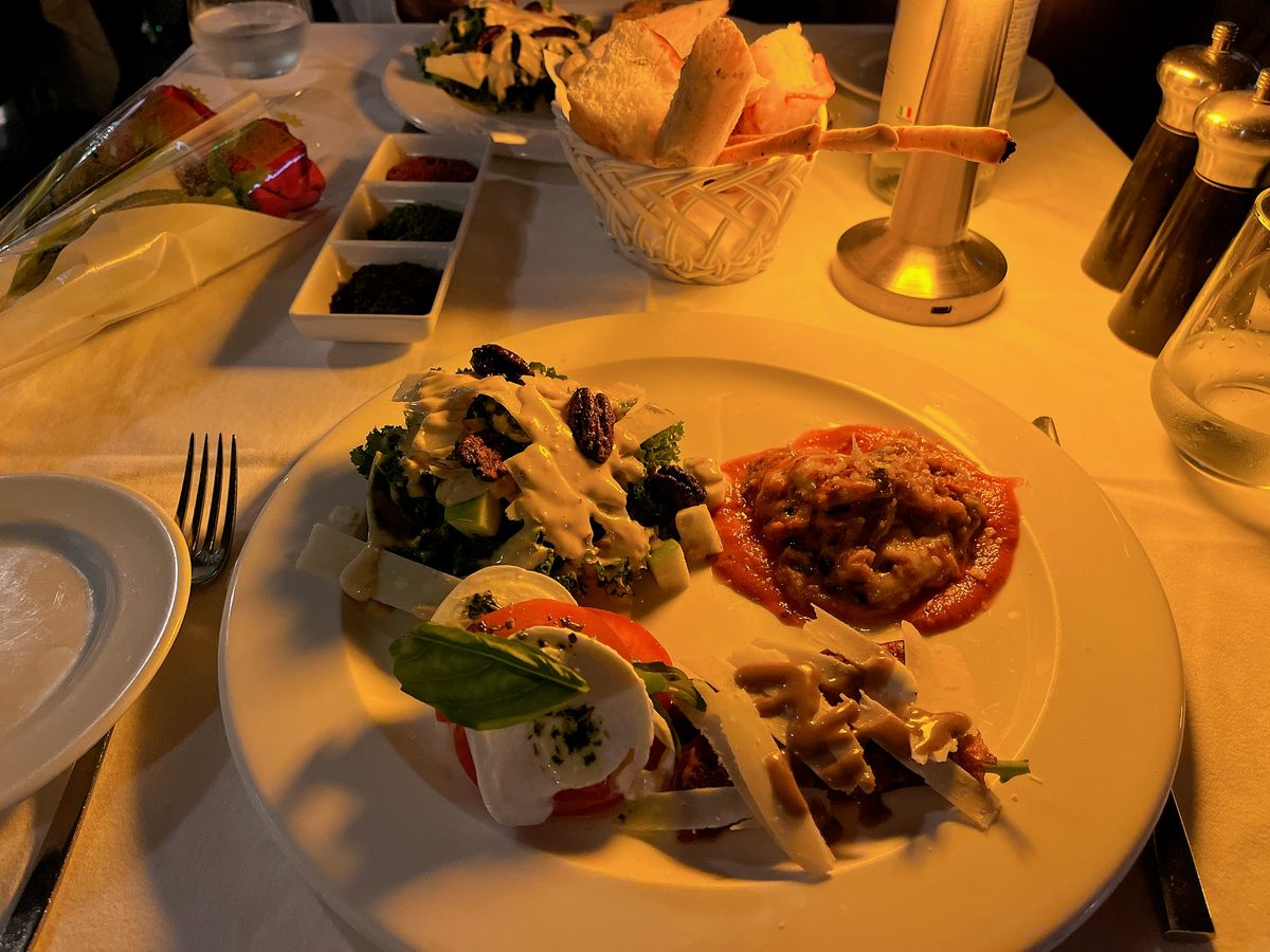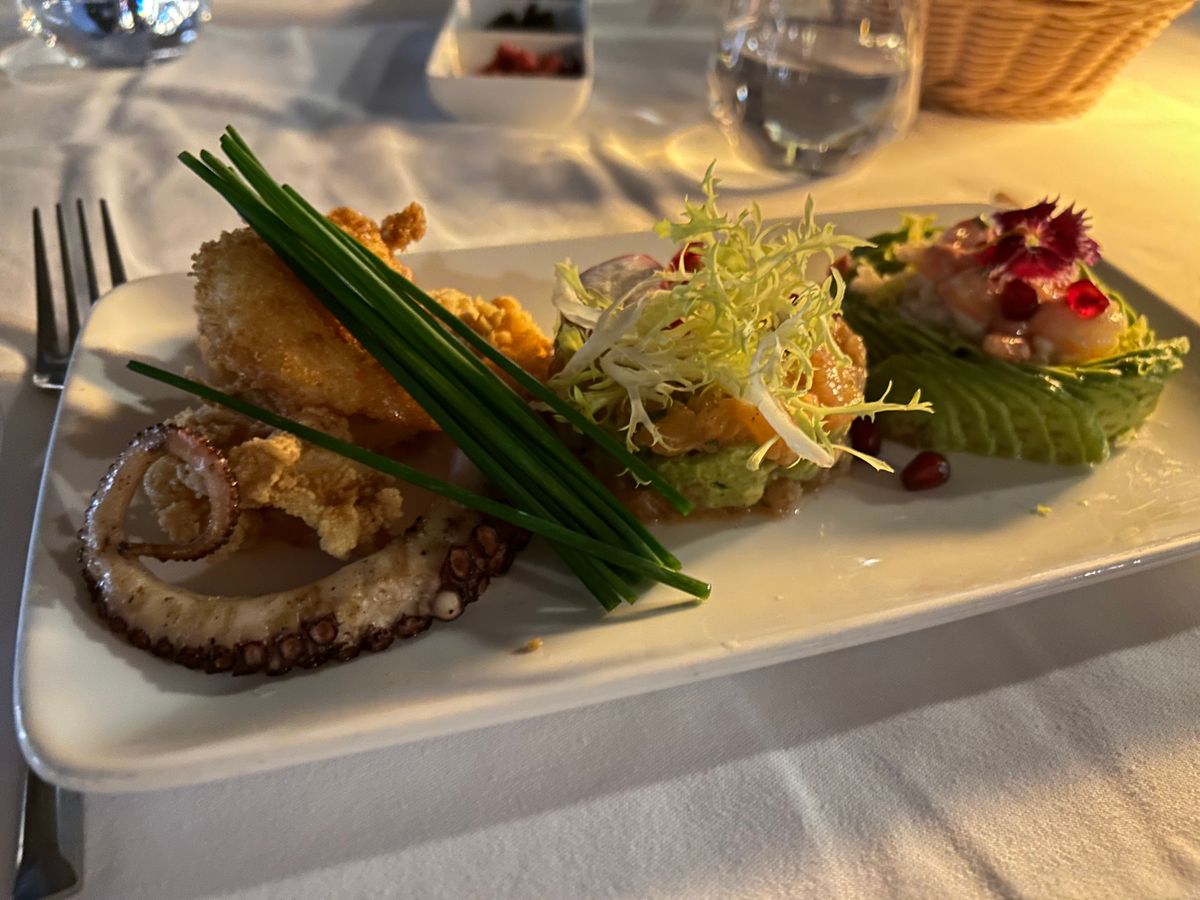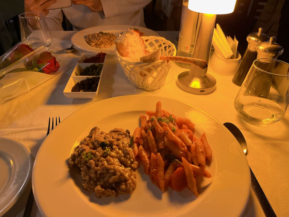 食事は、お魚のコースにしました。どれも美味しくて感動しましたが、前菜、パスタ、メインまで驚くほど量が多く、食べきれませんでした。店員さんが優しくて、メインのお魚をパックに包んでくださったので、デザートは食べきれました!ありがたや!!神様!!