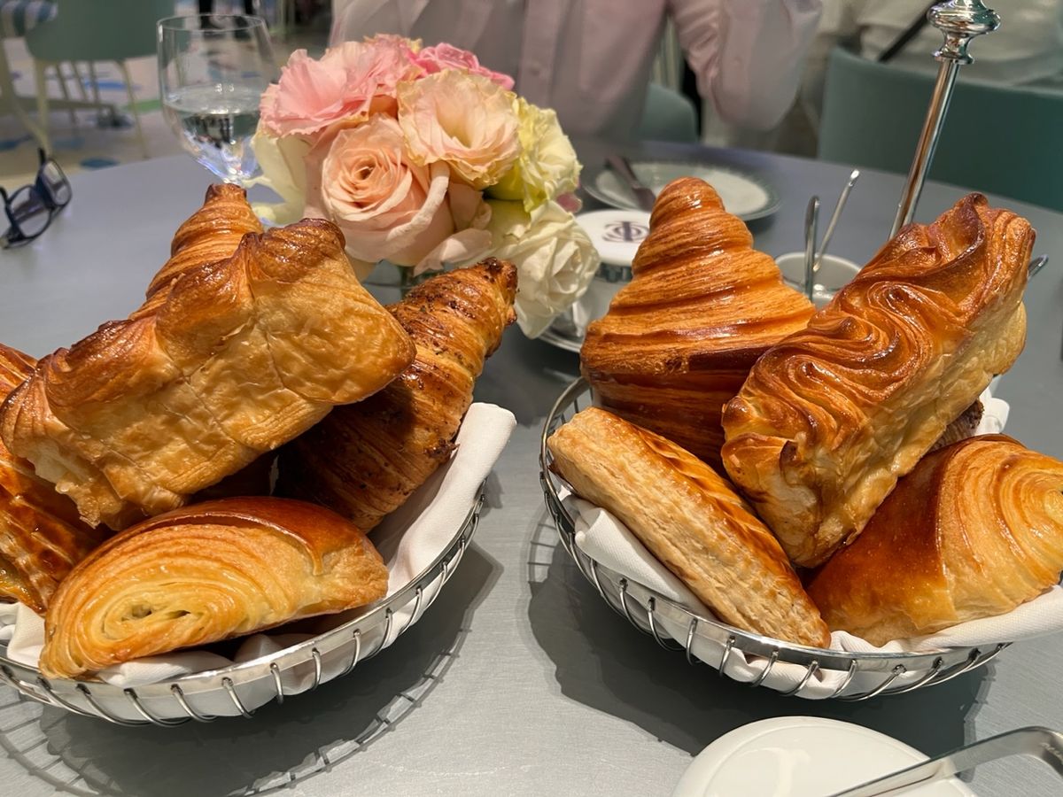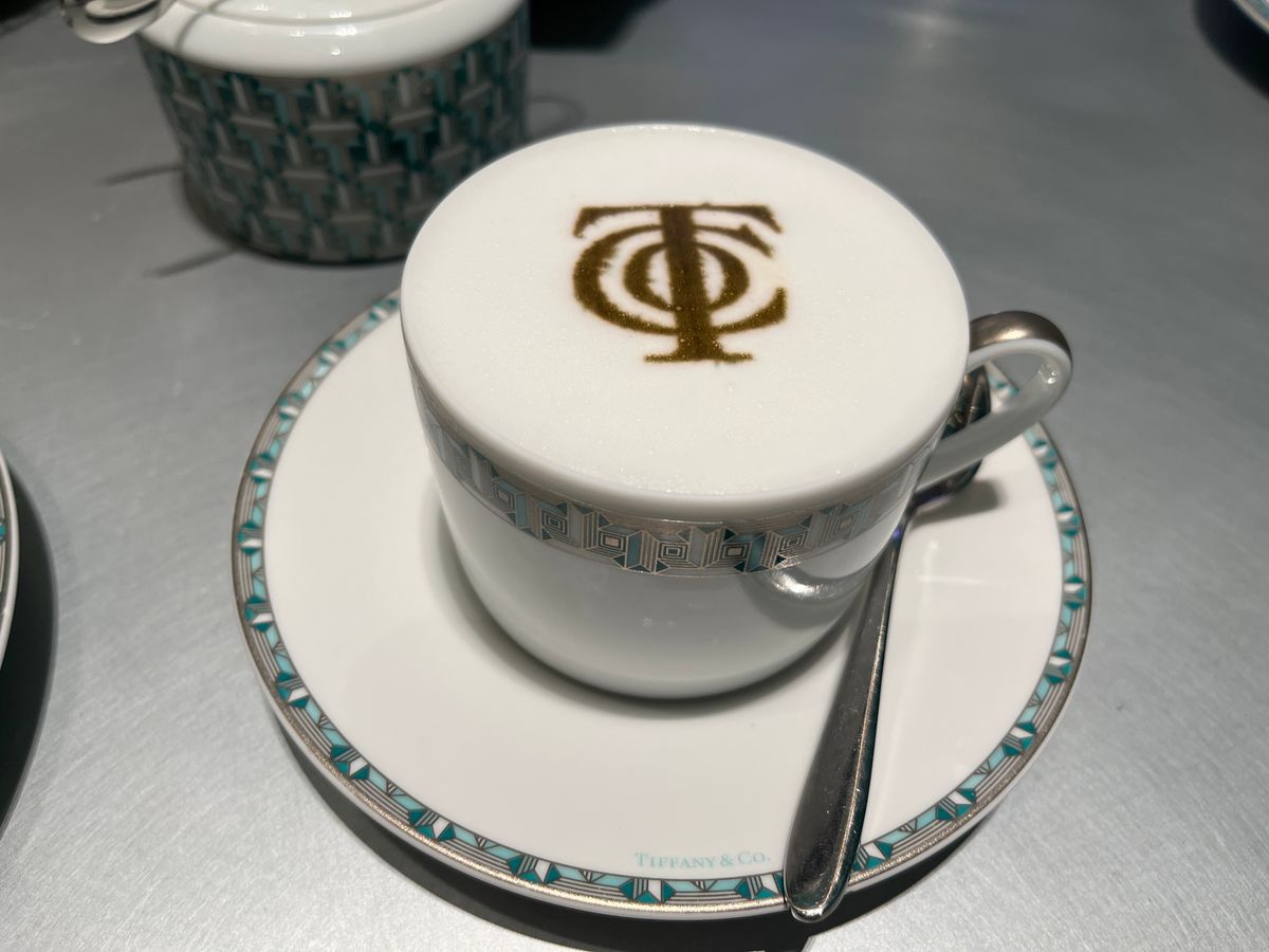 お皿もカトラリーも全部ティファニー!ちなみにお皿はウェブで購入できるようです。見るからに美味しそうなパン類は、サクサクのフワフワ。お店の人が「ドバイで一番美味しいと言われています」という通り、本当に美味しいです。カフェラテのティファニーのロゴアートも素敵です。