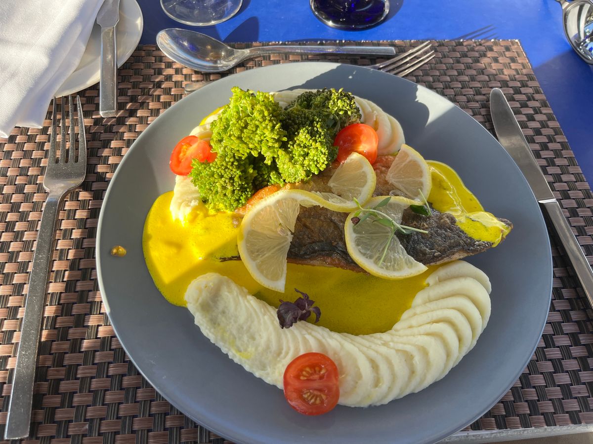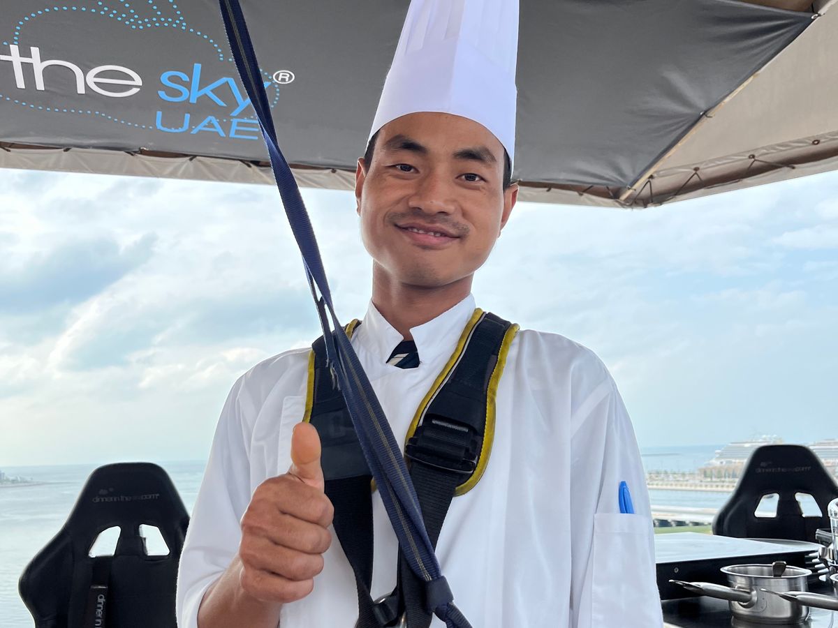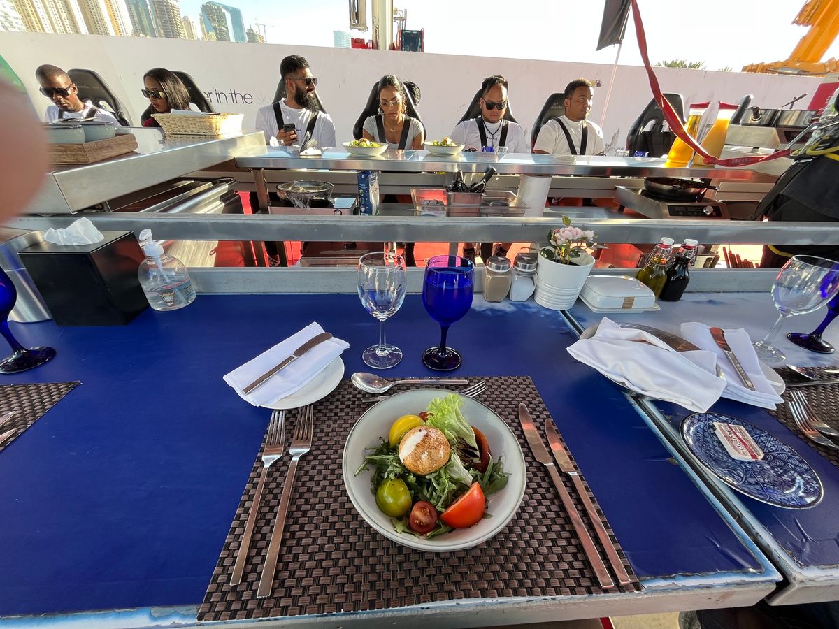 控え目に言って、最高です!!最初は怖かったのですが、段々と慣れてきて、シートのリクライニングを自分で倒してみたり、椅子を回転させてみたり、そうすると景色とスリルを存分に楽しめます!料理はある程度調理されたものをシェフが上空で火を入れて、一皿づつ盛り付ける本格的なもの。シェフ着に「Meridien」の刺繍がしてあるので、料理は5つ星ホテルのものではないかと思います。前菜はブラータチーズのサラダ、メインはスズキのソテー、デザートはシフォンケーキ&アイスクリームでした。どれも美味しく、ボリュームも多いので、お腹一杯になりました。