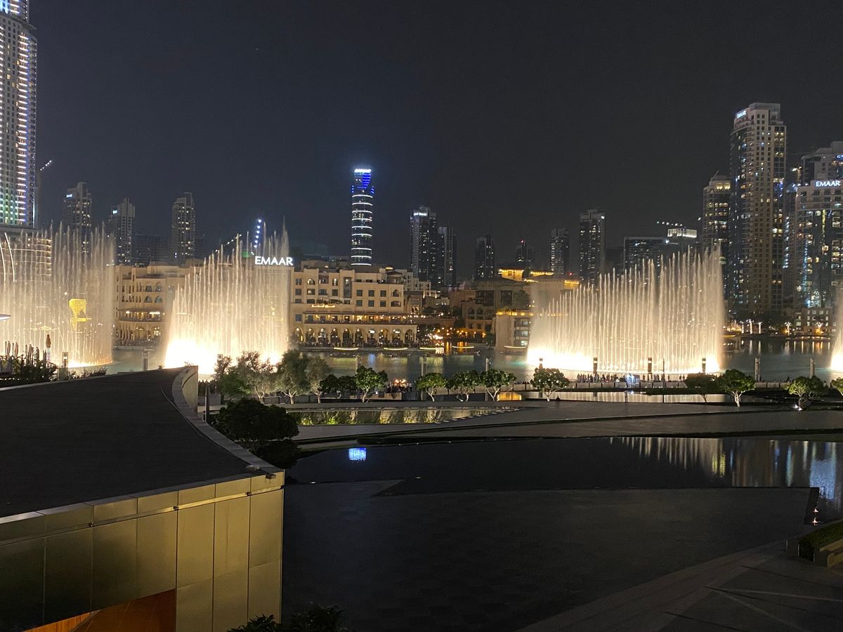 バイオリンの生演奏あり、ドバイ噴水あり。遠くには砂漠。砂上の楼閣なんて言葉が浮かんじゃうほどの現実離れした空間でした。