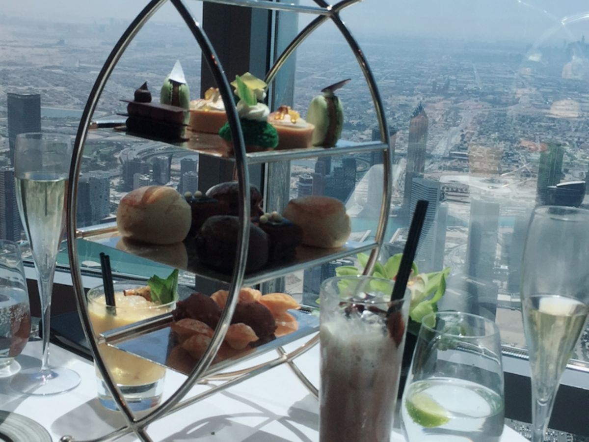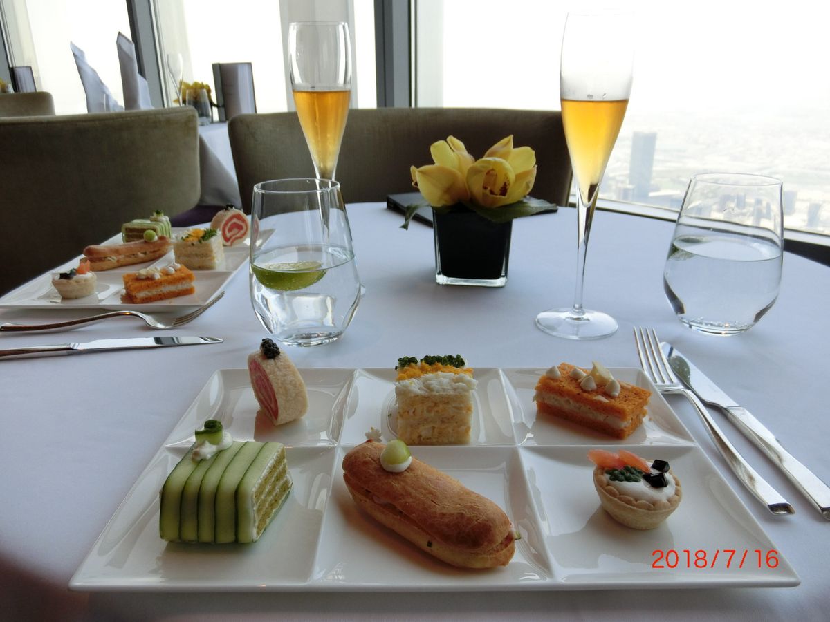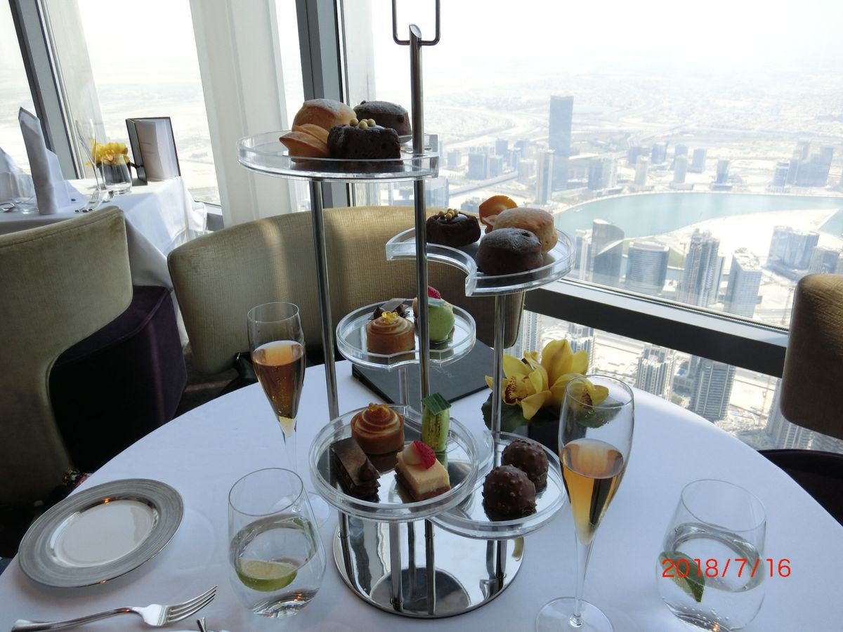 アフタヌーンティーを予約しました。世界一のタワー123階からの景色は、近未来的なビルディングと昔の姿を残す砂漠とが一望できますので、少し高くても窓際席をお薦めします。料理もアフタヌーンティーというよりも贅沢なランチのように時間をかけてゆっくり頂くので動けないくらいお腹一杯になりました。スタッフはとてもフレンドリーで、特に飲み物のチョイスが素晴らしく、感動の連続でした。また、生のヴァイオリン演奏もあり、テーブル席まで来てくださいました。最後にトイレから見える景色も素敵でしたので、帰りには是非行かれてみてください((笑)。