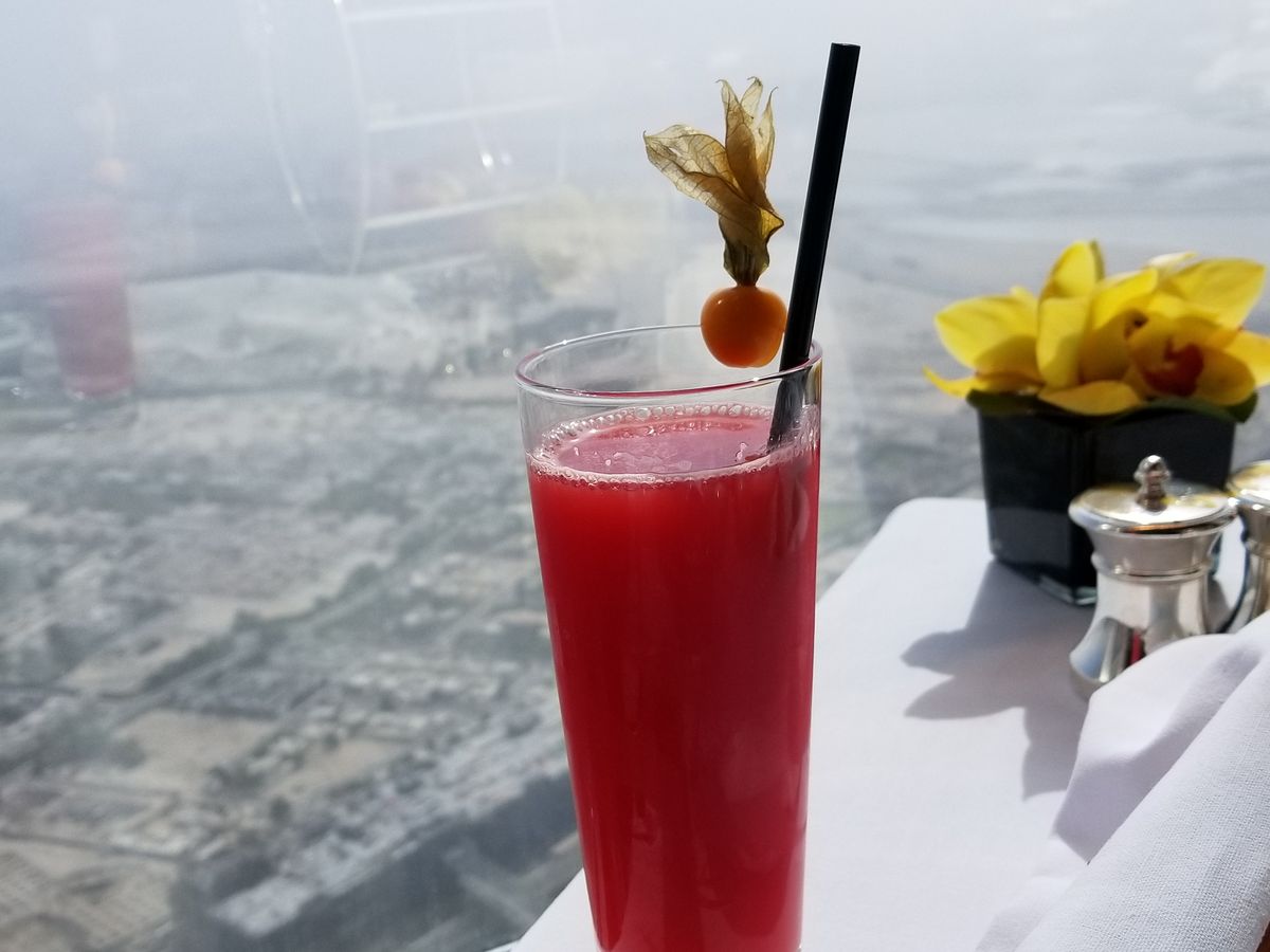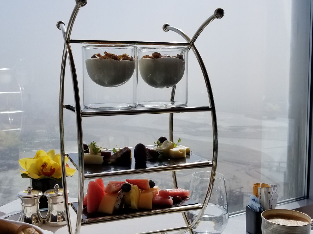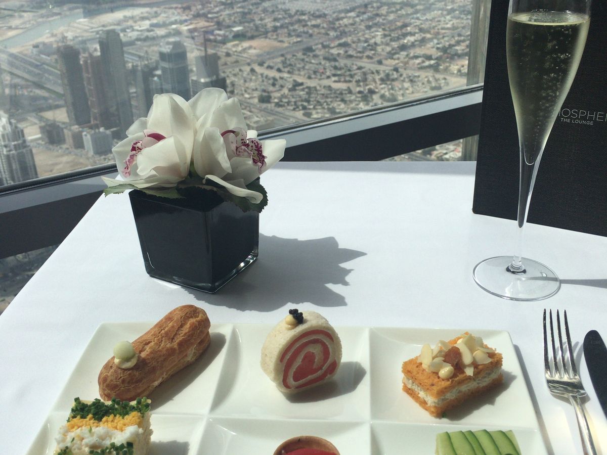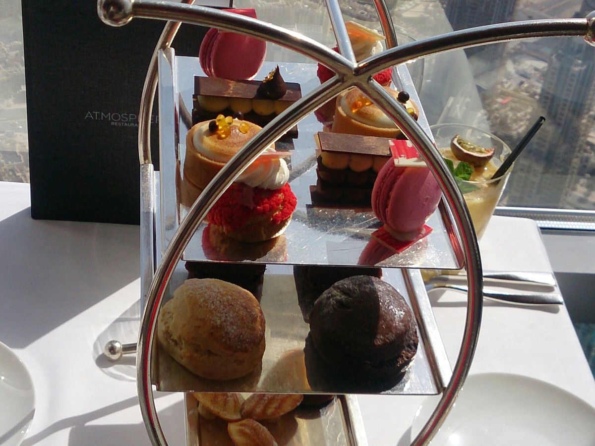 アフタヌーンティーを予約しました。世界一のタワー123階からの景色は、近未来的なビルディングと昔の姿を残す砂漠とが一望できますので、少し高くても窓際席をお薦めします。料理もアフタヌーンティーというよりも贅沢なランチのように時間をかけてゆっくり頂くので動けないくらいお腹一杯になりました。スタッフはとてもフレンドリーで、特に飲み物のチョイスが素晴らしく、感動の連続でした。また、生のヴァイオリン演奏もあり、テーブル席まで来てくださいました。最後にトイレから見える景色も素敵でしたので、帰りには是非行かれてみてください((笑)。