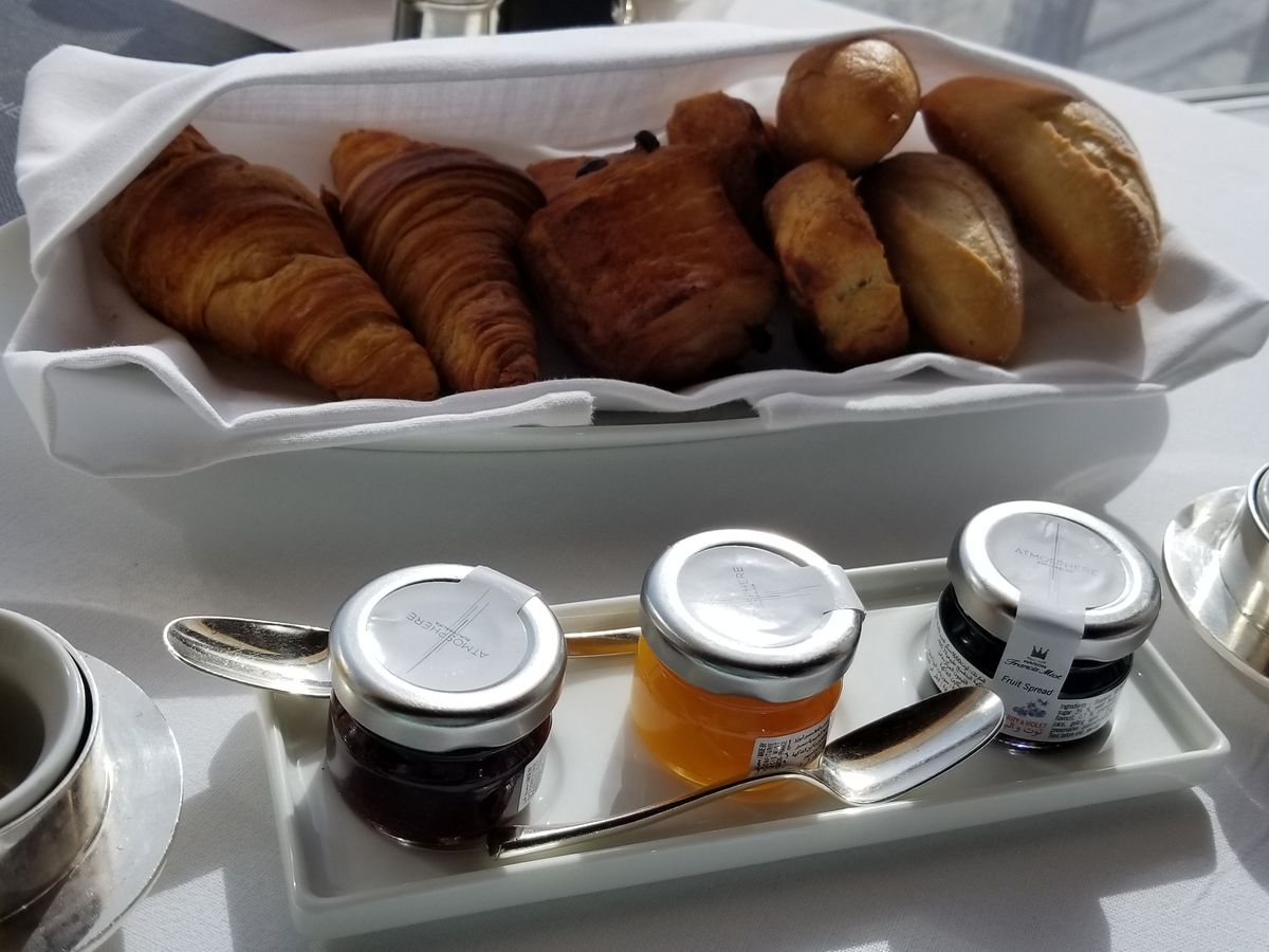 At the Top(124・125階展望台)だけでもUSD50なのに、豪華な朝食が食べれて、この値段は素晴らしい。ブッフェ形式ではなく、メニューから一品チョイスして、豪華なモーニングセットを用意してくれます。美味しいパンがいっぱい! 美味しいソフトドリンクは好きなだけ注文できます。レストランより、トイレからの景色が驚愕でした。^^